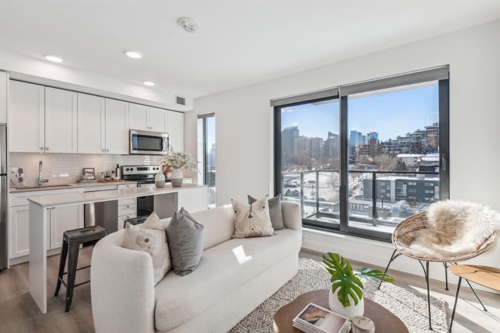 Incredible views at an affordable price point! Welcome to your dream urban retreat located on the cusp of Bridgeland and Crescent Heights. This brand new, funky one bedroom unit is the epitome of modern living in one of Calgary's most desirable neighbourhoods. This unit is the perfect rental investment, or for buyers looking to be in the heart of the action at an affordable price point. The open floorplan offers a seamless blend of the kitchen and living space, opening up to a private balcony creating a secondary hang-out space. The separate bedroom offers privacy. The unit features vinyl plank flooring, quartz countertops, white cabinetry, stainless steel appliances, an effective kitchen island, AC, and in-suite laundry. The unit comes with a titled underground parking stall and a titled storage locker for your extra items. Developed by Minto Communities, the Era building was sustainably built for the future targeting LEED certification. A smart security and resident engagement system is integrated with the units offering one way video calling, facial recognition access, package locker integration, community messaging and virtual concierge services. A rooftop patio offers a place for residents to gather or entertain their friends with unobstructed views of the Calgary skyline, firepits for cozy catch up sessions along with barbecues and a great indoor workspace. Located in a prime location, Era is just steps away from fantastic shops, restaurants, parks, playgrounds, the river pathway system, downtown Calgary and transit options including the Bridgeland LRT station.