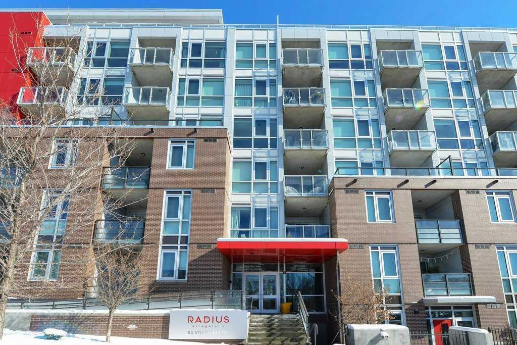 Welcome to the Radius, where luxury meets convenience! This bright 1-bedroom condo offers a modern living experience with top-of-the-line features and amenities. As you step into the unit, you are greeted by a large entrance that sets the tone for the rest of the space. The modern kitchen is a chef's dream, featuring quartz countertops and high-end appliances, including a Fisher & Paykel fridge, Bosch gas range, Bosch microwave hood fan, and Bosch dishwasher. The unit boasts luxury laminate floors throughout, creating a warm and inviting atmosphere. The full-sized in-suite laundry adds convenience to your daily routine. The generous living room opens onto a large, covered balcony (with gas hook-up for BBQ), perfect for enjoying your morning coffee or evening wine. The beautiful 4-piece bathroom is a spa-like retreat, with tons of storage, a full-sized tub, frameless glass shower, floor-to-ceiling tiles, and quartz countertops. Adjacent to the bathroom, you'll find a walk-through closet that leads to the good-sized bedroom. The bedroom features a full wall of windows, allowing natural light to flood the space. The Radius offers an array of amenities, including a concierge during the day to manage building activity, grocery, and Amazon deliveries. There are two gyms, one on the main floor and another on the 3rd floor, as well as a yoga room and a bike spin room on the 5th floor. For outdoor enthusiasts, the building features bike storage, and a bike/ski/snowboard maintenance area. Pet owners will appreciate the dog wash and grooming area in this dog-friendly building. Find a community roof top patio with spectacular city views, barbecue area and available for party rental. Parking is a breeze with titled underground heated parking (Stall 19), and a personal storage unit (# 141) is provided on the 5th floor for your convenience. Don't miss out on this fantastic opportunity to live in the Radius, where luxury, convenience, and style await you!