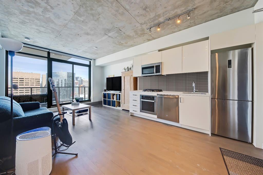 Step into urban living with great style. A 1 bedroom, 1 bathroom and in unit laundry. A condo that beautifully marries industrial flair with modern sensibilities. As you enter, you're greeted by an open-concept layout that seamlessly blends living, dining, and kitchen areas, making it the perfect backdrop for both relaxing and entertaining. The industrial influence is thoughtfully presented through elements like exposed concrete ceilings and oversized windows. Creating a space that feels both escalated but inviting. This is a smaller footprint with an impact. The kitchen is a standout, boasting contemporary finishes with a European layout. Sleek cabinetry, stainless appliances, and stylish fixtures come together to offer a culinary space that is as functional as it is beautiful. Efficient square footage and a thoughtful layout maximizes the living space, ensuring that every inch is utilized to its fullest potential. Large windows flood the space with natural light, enhancing the airy and open feel of the condo. Residents will appreciate the convenience of underground parking, a coveted amenity that not only provides security but also adds to the ease of urban living. This condo is a blend of style, comfort, and convenience. Ideal for those who appreciate the finer things in life, this property promises a lifestyle of effortless sophistication. The building also embraces these styles , function and ease with concierge and clean commode spaces for all necessary functions. Welcome home to 2504.