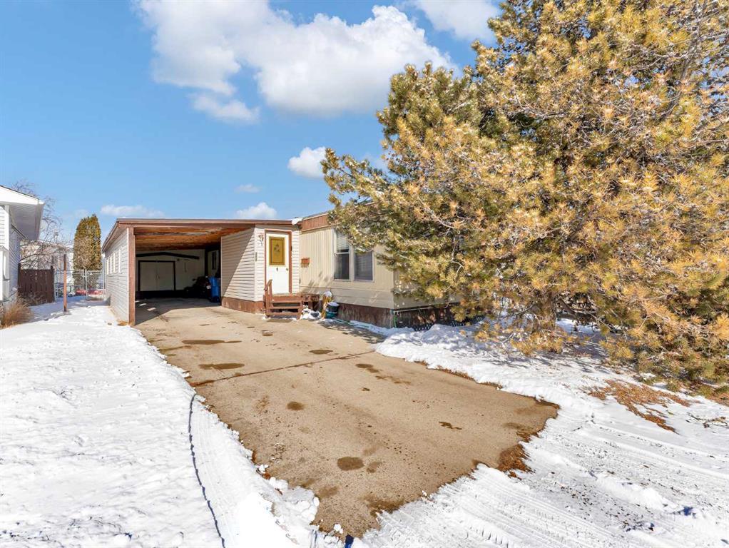PRICE REDUCED! Affordable manufactured home, situated on it's own lot in Tower Estates. Presents 999 Sqft of comfortable living space with a thoughtful layout. Upon entering, you'll be greeted by a spacious and bright living room that seamlessly connects to the dining area and kitchen. The generously sized kitchen features a pantry and a convenient eat-up breakfast bar. Moving down the hallway, you'll find 2 bedrooms, a 5pc bathroom with laundry facilities, and the primary bedroom located at the rear of the unit. The backyard offers a relatively private space with a covered deck, perfect for enjoying the summer weather. The property includes a carport connected to a storage shed, as well as a driveway for additional parking. NO LOT FEES! This home is vacant and available immediately!! Call today for a private tour!