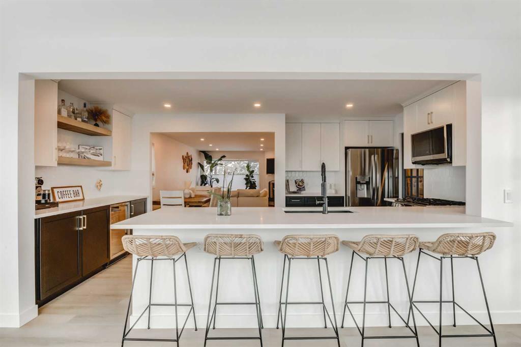 **OPEN HOUSE SAT & SUN, MARCH 9th & 10th (1:00pm - 3:00pm)** Introducing this exquisite 4-bedroom bungalow, boasting 1,500 square feet (above grade) of living space that has been beautifully renovated with modern elegance and sophistication. Upon entering, you'll be greeted by a spacious floor plan with luxurious vinyl flooring that spans the main level, offering both warmth and comfort. Tons of large windows flood the space with natural light, enhancing the airy ambiance of the home. Past the dining area, you'll find a custom built-in coffee station, with bar fridge and tons of additional storage and shelving. The kitchen has been thoughtfully renovated, featuring an open concept layout and premium upgrades that transform it into the heart of the home. Superior two-tone cabinetry with soft-close doors, complemented by gold accents, exudes luxury, while top-of-the-line LG stainless steel appliances make any chef eager to cook in this incredible kitchen. Additionally, a newly added walk-in pantry and updated laundry space have been seamlessly incorporated into the space. Newly added french doors lead out to the beautiful back deck with views of downtown, providing the perfect spot for hosting summer barbecues. And for those seeking even more outdoor space, the expansive rooftop patio situated above the double detached garage awaits. You'll spend countless days hosting friends and family in this great outdoor oasis. Step back in time and head down to the lower level. This well-maintained basement features an additional bedroom, a renovated half bath, and a spacious entertainment/bonus room. Adding to its allure, a cozy gas fireplace, vintage walk up bar, and classic wood wall panelling create a cool retro vibe, making this space perfect for relaxation and for your movie night. Within the community are tons of great outdoor amenities, including the serene Silver Creek Park and Bowmont Park. Enjoy a year round pathway system, the botanical gardens, off leash parks for your furry friends, and the outdoor community pool for those hot summer months. Golf enthusiasts will appreciate the proximity to the Silver Springs Golf and Country Club, right in your backyard. Don’t miss out on the opportunity to make this incredible property your new home!