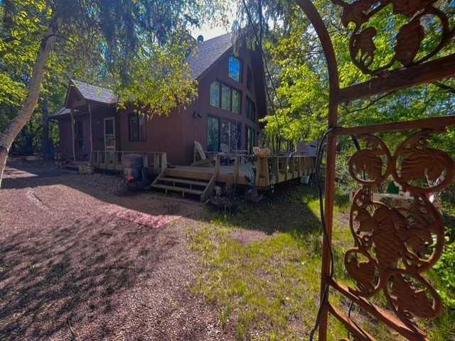 Just over an hour from Edmonton or Red Deer will have you arriving at your year-round escape on the lake in Camrose County! Surrounded by trees, this bright, open to below A-Frame home on a hill has ceiling to floor windows overlooking the lake with a bedroom and bathroom on each level. The beautiful spiral staircase plus a central, two-sided stone fireplace enriches the cedar-lined walls and open concept with warmth and taste! Shingles on the home and bunk house have been replaced in the last two years, the carpet for the stairs and second level has recently been removed, leaving you the freedom to customize the finish to your wishes. There is a well on the property and your recreation and storage needs are covered with the detached double garage complete with heat and water, wood sheds, studio bunk house with wood stove, and a boathouse near the water for your aquatic toys. Enjoy the tranquility of wildlife and sunsets from your wrap around deck, while growing in your garden or gathering around the firepit! Between your property line and the water is an additional approximately .5 acres of conservation land for your use and enjoyment. If peace, privacy and proximity are what you're looking for in a property - put this one on your list to view today!