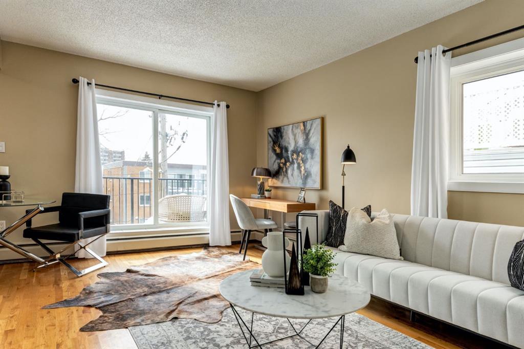 PRICE REDUCED! TOP CORNER UNIT with SOUTH EXPOSURE & LARGE BALCONY! This building is SPECIAL as it situated just off the banks of the Elbow River and located on a quiet street, in a cul-de-sac, tucked in behind the Holy Cross Hospital site - all in popular MISSION. Walk to all amenities - grocery stores, pharmacies, coffee shops, restaurants, fitness centres, boutique stores, green-spaces, and parks. This exceptional one-bedroom TOP FLOOR unit has been beautifully appointed with extensive HARDWOOD, newer carpet in the bedroom, ceramic tile in the bath, AND has been NEWLY PAINTED with a neutral colour. Recent additions also include a BRAND NEW European washer/dryer combination, new light fixtures and new modern window treatments that add a touch of luxury and warmth. The open concept Living/Kitchen area is perfect for entertaining with an EAT-UP BAR, sleek black appliances and a bright Kitchen Nook. The Living Room is also bright and sunny and LARGE enough to easily accommodate a HOME OFFICE or Formal Dining area. Another BONUS is the LARGE SOUTH facing Balcony that could add an additional 60 square feet of living space on those countless sunny days in Calgary. The Primary Bedroom is large enough to fit a KING SIZED BED, two side tables and a console/dresser. The bedroom closet also comes with organizers. Don't miss this gorgeous property! It is sure to IMPRESS! CONDO FEE INCLUDES HEAT/ELECTRICITY.