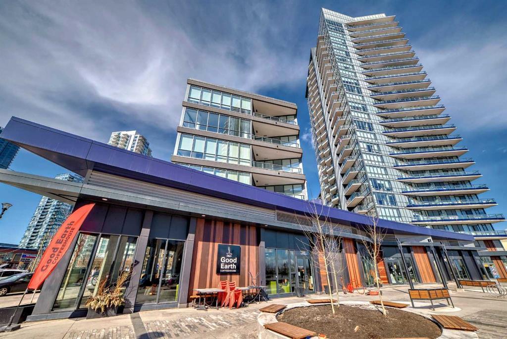 This contemporary 1-bedroom residence at the Verve offers a luxurious living experience with a host of desirable features: Thoughtfully designed open floor plan, perfect for hosting gatherings. Kitchen equipped with integrated appliances, quartz countertops, and a spacious central island with a built-in breakfast bar. Modern touches such as wide plank flooring and distinctive lighting fixtures. Full-size ensuite laundry for convenience. Generous private balcony with stunning downtown views. Titled underground parking space and separate storage locker included. Full-service amenities including a concierge, indoor lounge with fireplace and large-screen TV, exercise room, outdoor patio area with BBQ and fire pit, and a 25th-floor observation deck with breathtaking views. Security features including full-time staff, concierge services, guest suites, and underground visitor parking. Convenient location steps away from the river path system, shopping, restaurants, transit, zoo, and the new Central Library. Don't miss the opportunity to make this your new home!