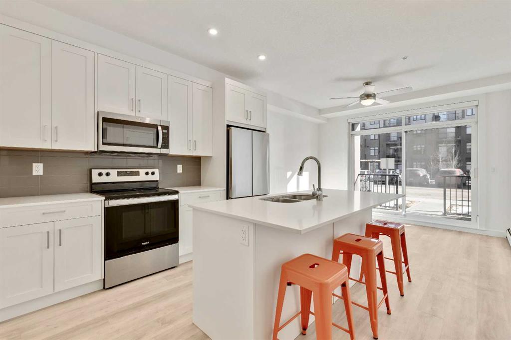 This stunning two-bedroom apartment is a perfect opportunity for first time home buyers, someone looking to downsize, or an investor looking for a rental property. Located in the new community of Seton and surrounded by many amenities, including shopping, theaters, restaurants, rec center, parks and much more. This first floor unit has modern finishes including vinyl plank flooring, stone counter tops, stainless steel appliances, and in unit laundry. The large walk-out patio gives you easy access to the dog park area, or guests coming to visit don't have to walk through the building. Keep your car warm and dry in the parkade with a tiled parking space. Need more room for storage? The unit comes with a caged storage space located in the parkade. Deerfoot access is just a short drive away making it easy to access the city. This unit is priced to sell quick.