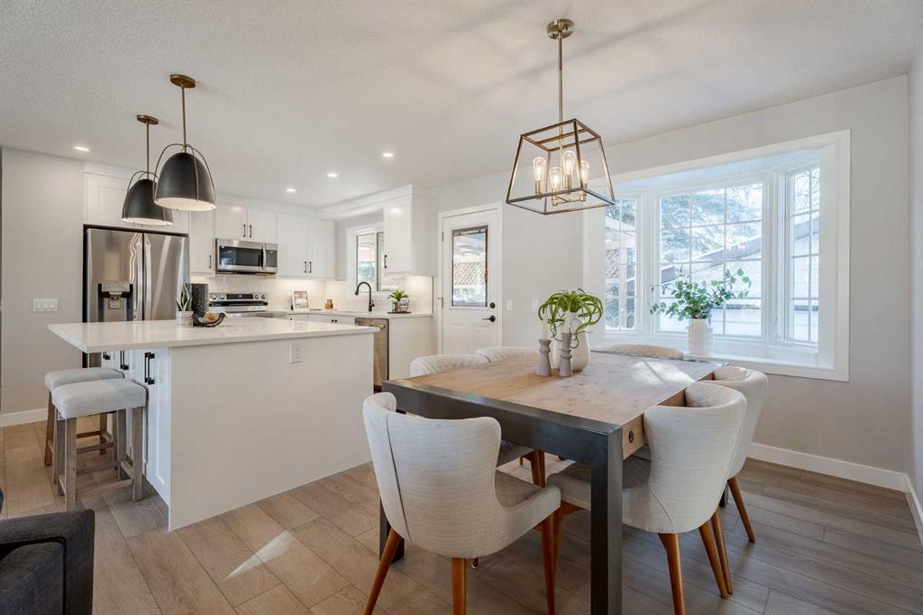 FULLY RENOVATED & TURNKEY! This beautiful and charming bi-level house is situated in a quiet cul-de-sac and close to many parks in the great Oakridge neighbourhood. Upon entry you will be welcomed with an open concept layout where living room and dining area have bay windows that bring natural light inside. Brick gas fireplace harmonizes with pot lights and light fixtures and gives a rustic feel in this modern style house. Kitchen has shaker style, soft closing, white cabinets to the ceiling height; huge island has lots of storage space on both sides. Kitchen window overlooks deck with pergola and private backyard. Master bedroom can accommodate king size bed, 2 additional bedrooms and main bath with double vanity will complete main floor. Basement is fully finished with family room where you can have TV and game area; along with wet bar, drink fridge and built-in wine rack it is great entertainment space. Full bathroom with window will serve 2 bedrooms on this level. Single oversized garage, long driveway and beautiful private backyard will complete this lovely house. Close to shopping, schools, easy access to Stoney trail makes this great location. HE Furnace-NEW, HWT- 1-2 years old.