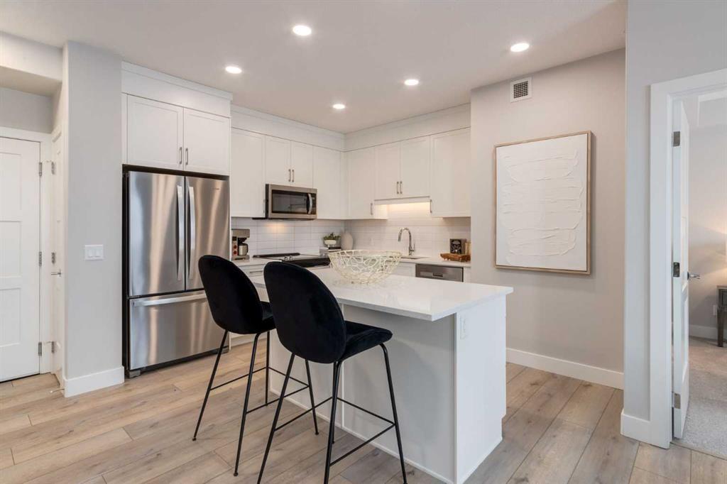 Welcome to this new modern low-rise top-floor condo at 85th & PARK in Aspen Landing! This 4th floor suite showcases beautiful finishes, including upgraded stainless steel appliances, 40" white ceiling-high cabinetry, luxury quartz countertops, newly painted walls and closets, and upgraded LVP flooring throughout the main floor and bathrooms. The layout of the kitchen includes sufficient space for a kitchen table, and the over-sized island provides additional seating. Conveniently located off of the dining area is a closet with a stacked washer and dryer set. The large windows in the living area and bedrooms allows for natural light to flood the space. An A/C unit in the living room is also included, perfect for those hot summer days. Both the primary and second bedroom feature a walk-through closet to the ensuite bathrooms. Enjoy a morning coffee or evening BBQ on your North facing deck with clear glass railings. Additional features include in-floor radiant heat throughout the suite, a heated underground parking stall and bike storage room in the parkade, as well as optional EV charging stations. Safety features include a personal ID card for entry points, video surveillance at access points, and a brightly illuminated parkade. The lobby is an inviting, cozy space with seating areas and a central fireplace. Across from the Aspen Landing shopping centre, and adjacent to the future Springbank Hill Market shopping district, this is a prime location with easy access to amenities and downtown, as well access to an expansive trail system for avid walkers and cyclists. Don't miss your chance to own this beautiful, bright contemporary condo in Aspen Landing!