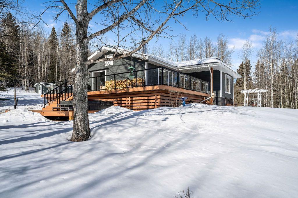 Outside, you can relish in over 700 sqft of decking that wraps around the north and east sides of the home and provides an ample amount of storage underneath. The south side patio features beautiful stonework, providing the perfect space to soak in the breathtaking views. At the back of the property, you will find an oversized double detached garage, two garden/storage sheds, and a trailer parking pad. The property is fully fenced and landscaped, and you will discover various fruit trees, including apple and pear.