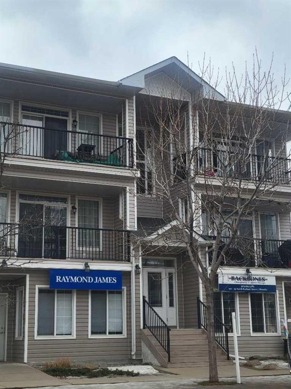 ONLY MINUTES ON THE MARKET AND WE ARE SOLD! Live in the heart of Okotoks and enjoy this lovely 2 bedroom, 2 bathroom condo. This west side corner unit is bright and welcoming with an open plan offering loads of space. Natural light streams in on 3 sides of this 1,145 sf unit. With both a front door and a back door, access is great! Beautifully kept, neutral colors. Very large living room enjoys sliding patio doors to the covered balcony ~ sweet space for your morning coffee or afternoon libation. Dining area is flexible. White cabinetry and appliances grace the kitchen. Center island has further storage space. Primary bedroom has large walk-in closet and 4 pc ensuite with a view of the river and pathways. Second bedroom is a generous size. A 4pc bathroom just across the hall. Full washer and dryer in the laundry/mechanical room. Each unit has their own furnace and hot water tank. Assigned outdoor stall parking. Visitor parking on the street. Only 4 residences in this building - 2 business units. Enjoy the warmer months ahead exploring heritage Okotoks just outside your front door. Call today to view!
