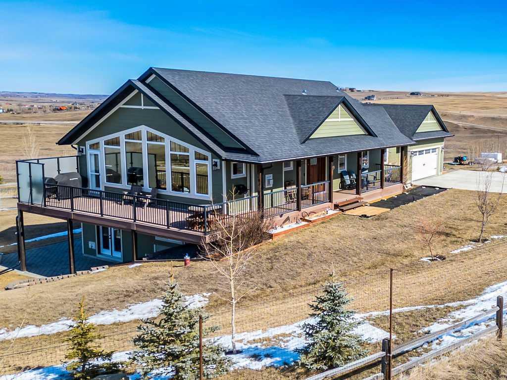 Welcome to this SUPERBLY MAINTAINED acreage property located just minutes SouthWest of Okotoks. Custom-built walk-out bungalow featuring over 2800 sq. ft. of professional development. Step into the home boasting soaring vaulted ceilings with a wall of windows on the west side facing those STUNNING MOUNTAIN VIEWS. The warm, inviting greatroom with packed stone fireplace and unique custom mantle opens into the dining area. A GOURMET KITCHEN with expresso stained maple cabinetry, includes a huge island boasting a custom-wood epoxy finished countertop, walk-in pantry and Stainless appliances. Like-new Ash hardwood flooring is a bonus throughout most of the main floor area. The primary suite ideal for your king-sized furniture offers a huge walk-in closet and SPA-LIKE 5 piece ensuite with heated tile flooring and deep soaker tub. As you venture down into the WALK-OUT lower level you will be greeted with a massive recreation room ideal for all your family gatherings or just relaxing watching a movie. There are two additional bedrooms, flex room and gym area plus a full 4 piece bath. A home for all seasons which includes heat and air conditioning. Garage is an oversized heated double attached. The shop is over 2400 sq. ft. , it is heated, includes a mezzanine area, and includes 3 huge oversized exterior doors. The acreage has been wonderfully landscaped and includes a sweet garden shed and 2 green houses, it features rasied beds ideal for growing vegetables or flowers. Fully fenced , beautifully landscaped, SUPERB home, huge shop and STUNNING MOUNTAIN VIEWS make this acreage a sure winner.