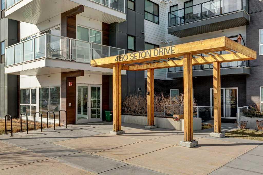 This fantastic condo is located in the vibrant south east community of SETON. The light pours through the large windows in this spacious unit with nine-foot ceilings, builder measurement of over 900 sq feet, overlooking a large park with views of the library and YMCA, and a glimpse of the mountains. This bright unit has two bedroom and two full bathrooms. This property is in close proximity to the YMCA, South Health Campus, and many shops in Seton. The gorgeous white kitchen is complete with breakfast bar, stone counters, upgraded stainless steel appliances, the fridge has an ice maker, the convection stove includes an airfry feature, microwave hood fan and dishwasher complete the efficient lay out of the kitchen. The large breakfast bar has room for 3 large bar stools. The dining area with patio doors opens to the 121 sq foot L-shaped balcony with glass railing to enhance the outdoor feeling. The primary bedroom comes with a walk-through closet and three piece ensuite. The second bedroom is located on the opposite side of the unit allowing for privacy and next to the four-piece main bathroom. Keep cool on warm days with the single zone mini-split air conditioning unit. The colours in this unit are neutral and calming. The luxury vinyl plank floors flow through the major space of the unit with soft carpets in the bedrooms. The two titled parking stalls are a huge bonus with this home along with the assigned storage locker and bike storage. Don’t miss out on this amazing home!