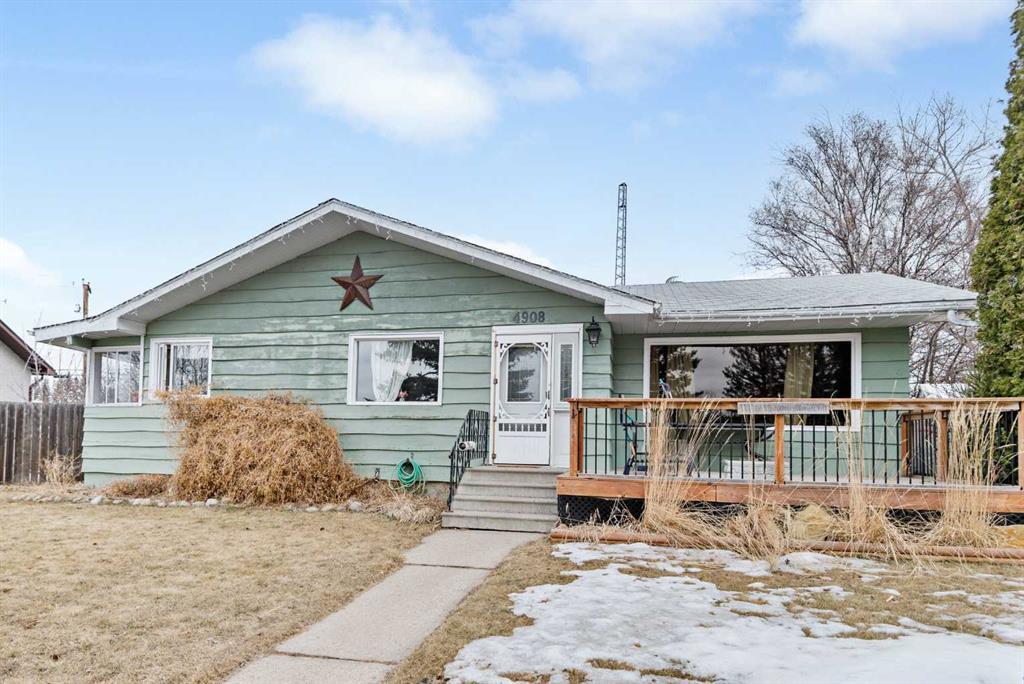Welcome to 4908 39 Street in Innisfail, AB, where comfort and convenience await you. Nestled on a spacious pie-shaped lot, this charming home offers a serene oasis amidst lush greenery. As you step onto the property, you'll be greeted by a landscape with crab apple, red apple, saskatoon, and cherry trees, creating a perfect setting for outdoor gatherings. A generous fire pit area invites you to cozy up under the stars, making memories that last a lifetime. Upon entering the home, you'll find an open concept living room and kitchen, ideal for entertaining guests or enjoying quality family time. The primary bedroom features a lovely office space just outside, where productivity meets comfort. Rest assured knowing that central air conditioning will keep you cool and comfortable indoors during the warm summer days. Descend into the lower level, where a cozy ambiance awaits, complete with three additional bedrooms and a full bath for added convenience. The expansive family room sets the stage for countless movie nights and gatherings with loved ones. Step into the fully enclosed porch area, a delightful three-season space that transitions seamlessly to the oversized garage. Here, you'll find the perfect spot to unwind and relax. Convenience is at your fingertips with amenities such as swimming pools, hospitals, schools, and shopping just a short stroll away. Ample space for RV parking ensures that all your recreational needs are met with ease.