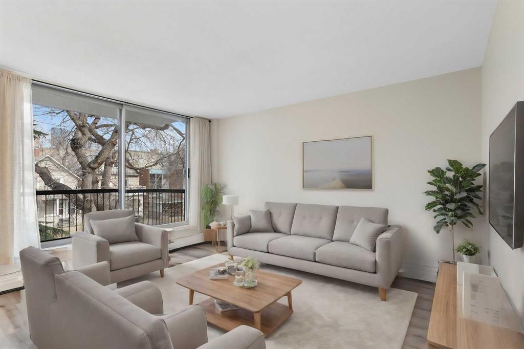 This 1-bedroom, 1-bathroom condo is located in the vibrant neighbourhood of Mission, offering urban convenience. Mission has the charm of a quaint village, with everything within walking distance – from restaurants and coffee shops to shopping destinations and the river pathway system. Perfect opportunity to leave your car in your designated parking spot and enjoy a 15 minute walk to downtown, hockey games and concerts on the Stampede grounds. Inside, find vinyl plank flooring and a modern black kitchen with stainless steel appliances, including a brand new stove and a movable island. Relax in the living room, with large patio doors opening onto a balcony surrounded by mature trees. The refreshed bathroom features contemporary fixtures and tile flooring, while the primary suite comfortably fits a king-sized bed. This residence boasts concrete construction for quiet living plus it has been freshly painted throughout and updated vinyl flooring. Additional features include in suite storage room, updated common laundry facilities (on second floor) & an assigned parking stall. This building is on a great street, making this condo an ideal urban retreat!