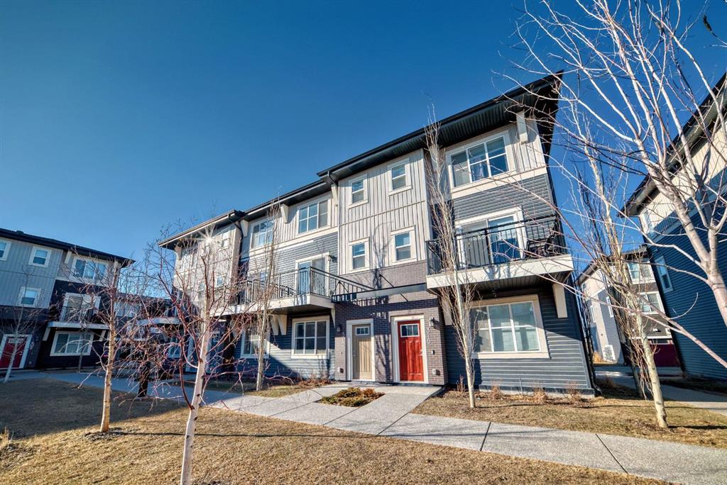 Introducing this attractively priced and meticulously maintained three-story residence nestled within YORKE TOWNHOMES at the heart of Cornerstone! Originating with its inaugural owners in 2019, free from smoke and pets, gleams in pristine condition. The ground floor features a versatile DEN/4th BEDROOM, supplemented by storage beneath the staircase and a double (side by side) attached and insulated garage. Ascending to the second level, revel in the contemporary color schemes and coveted open-concept layout, where high-quality laminate wide-plank flooring spans from the Living Room to the chic Kitchen and designated Dining area. Embellished with exquisite quartz countertops, ceiling-height cabinetry, stainless steel appliances, and a capacious central island, this abode exudes sophistication. Additionally, the second level boasts 9-foot ceilings, a powder room/2-piece bathroom, and a commodious balcony with a BBQ gas line, overlooking the picturesque interior courtyard replete with flowering trees, verdant spaces, walking trails, and a gazebo. Ascend to the third level, where a sizable PRIMARY BEDROOM awaits, complete with a 4-piece ENSUITE BATHROOM and WALK-IN CLOSET, alongside two supplementary bedrooms, a 4-piece bathroom, and the convenient upstairs LAUNDRY AREA. Bathrooms are appointed with quartz countertops and high-gloss ceramic tile flooring. Offering effortless access to an array of amenities, public transit, Stoney Trail, and Deerfoot Trail, this residence is conveniently situated near the airport and CrossIron Mall. Embrace the opportunity to claim this remarkable property as your own – schedule a viewing today to truly admire its splendor!