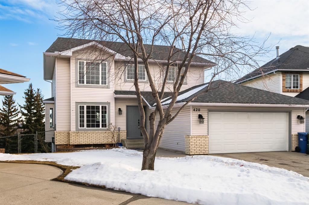 Fall in love with this beautifully renovated former two storey showhome set amongst the breathtaking landscape of Scenic Acres. This home has undergone various upgrades over the past decade, including a new roof in 2018, new quartz counters, new tiles throughout, new faucets and more, and is situated on a quiet cul-de-sac backing onto a greenspace, in a premier family oriented neighbourhood. With almost 2,000 sf of living space, and a stunning 17ft open-to-below feature, this bright and spacious home has plenty of room for living and hosting. Upon entering the family room you will note the immaculately maintained hardwood flooring that carries on throughout the main and upper levels. Through the large dining room you connect to the kitchen, which features bright white cabinetry and complementing stainless steel appliances. Picturesque views of the cityscape, Canada Olympic Park, and Rocky Mountains can all be enjoyed while seated in the well-lit dining area, cozying up by the gas fireplace in the living room, or breathing in fresh air on the huge south facing back deck. A powder room with upgraded hardware and laundry, mudroom, along with a cozy bedroom/den complete the large main level. In addition, there is direct access to the main level through an oversized double garage which has plenty of cabinetry for all your storage needs. Up above are three bedrooms, including the spacious primary retreat with sweeping views, a walk-in closet and an ensuite that boasts a gold-hardwared vanity, standup shower, and a jetted soaker tub. An additional full bathroom completes this level. Down below, the legal suite in the bright walkout basement can easily serve as a home office, guest quarters, or an opportunity to generate rental income. It includes luxury vinyl plank, a large bedroom, personal kitchen, 4 piece bathroom, separate laundry, and a recreation area. A home truly unlike any other, this lot's unique shape and positioning makes it one of the largest backyards in Scenic Acres. Out back there is a large shed and a direct gate access to a treelined pathway network for pedestrians and bicycles that connects to a nearby park and green spaces. Proximity to the ample amenities at Crowfoot Crossing, including the C-train station, make this a convenient location for all family members. Quickly connect to the rest of the city with easy access to Crowchild and Stoney Trail.