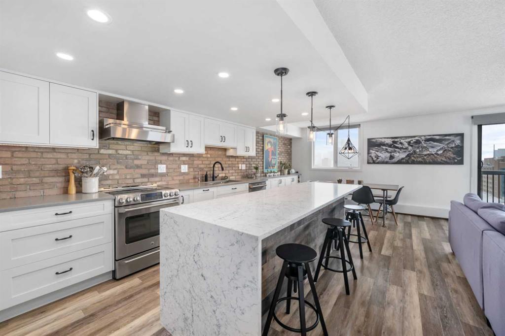 OPEN HOUSE: SAT. MAR. 30, 1:00-3:00PM. This is a MUST SEE property with stunning views in picturesque Mission! This well thought-out home is filled with smart storage/space planning, wrapped in a delightful color palette and sprinkled with just the right amount of timeless flare. The moment you step inside you will notice a bench where you can sit to comfortably remove your footwear and sigh in relief and comfort. You make your way through the hallway and notice to your right-hand side that behind the stylish barn door there is a washer and dryer neatly tucked amidst walls of cupboard space designed to store shoes, tools, supplies, etc. and hang laundry to dry discretely. Carrying through the hallway you enter a generously-sized primary bedroom with a shiplap feature wall that is accentuated by the morning through the east-facing window . This primary bedroom features a walkthrough closet equipped with built-in drawers, shelving unit and plenty of hanging space for clothing. If you peak behind, you will notice the back walls in the closet are protected by a layer of colorful, yet playful wall paper. The ceiling detail in the closet adds a classic touch to polish the vibe. The 4-pc ensuite bathroom features dual undermounted sinks, dual led-lit mirrors and a walk-in shower with 10mil glass and chic tile design. As you continue down the main hallway, you notice a second bedroom on your right-hand that is large enough to rival the size of primary bedrooms in new condo buildings. However, this second bedroom has "TWO" closets with organizers, allowing you once again to maximize your storage capacity. On the opposite wall you will notice a uniquely designed bookcase that can also double up as a display case for your favorite collectibles. Directly across the hallway from the 2nd bedroom you will notice an incredibly bright 4-piece bathroom with soaker tub, black fixtures and modern tile + finishing materials. At the end of the hallway you will witness an impressive single-piece Caesarstone island (no seam), crisp white cabinetry with great storage capacity - including slide-out/pull out pantry-style cabinets and plenty of drawers. The kitchen also showcases newer stainless steel appliances by GE Café, brick facada backsplash, undercabinet lighting and potlights. The kitchen opens onto spacious dining area with built-in cabinetry and a generously-sized living room where you can enjoy breath-taking views of Calgary's downtown core. Step out onto the balcony through the sliding patio doors and you will witness a jaw-dropping 180 degree views of the North, East and South horizons, including views of the Elbow Rivers. Cats ok with board approval, no dogs allowed. Amenities include Bluebox delivery, Exercise room, and Outdoor terrace. Offering an unmatched location near bicycle lanes, walking paths, Elbow River plus all the whops, restaurants and services along 4th Street SW and 17th Ave SW. Truly an amazing opportunity for home ownership.