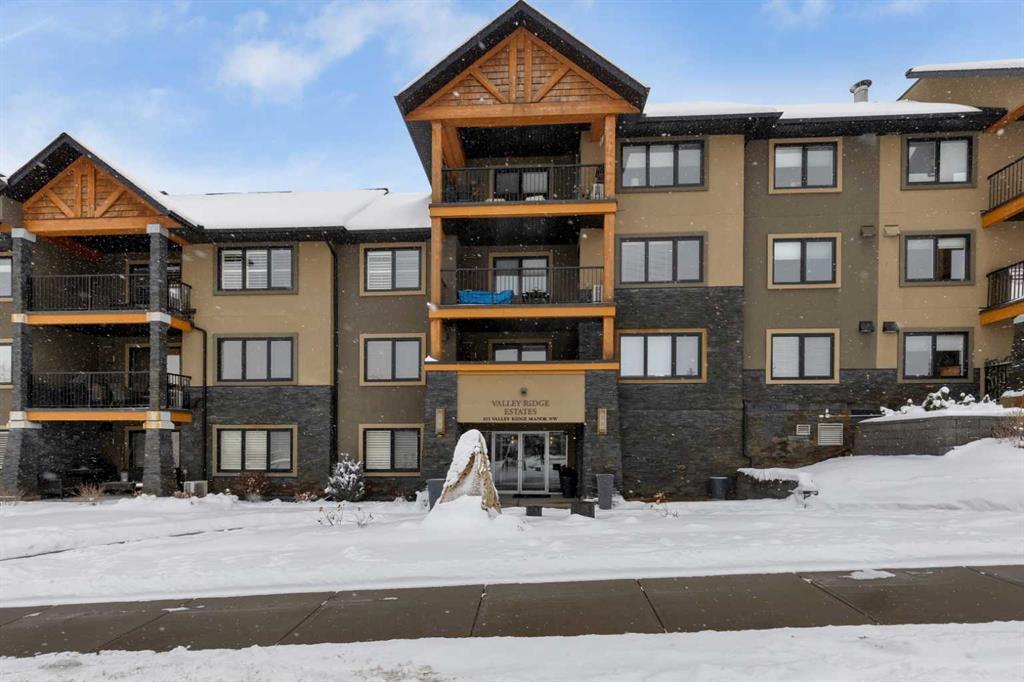 This unit and location offer plenty of features. Situated on the top floor with a west-facing balcony, it is just a stone's throw away from Valley Ridge Golf Course where you can enjoy golfing in the summer and dining at Mulligans Restaurant year-round. You'll also have easy access to the community's numerous walking paths and quick routes to both the mountains and downtown. The unit boasts an open concept living space with 9' ceilings, central air, a spacious kitchen with elegant dark stained cabinets, stainless steel appliances, granite countertops, under cabinet lighting, a breakfast bar, and a walk-in pantry. The dining area and living room lead to the large west-facing balcony equipped with a gas BBQ hookup. The primary bedroom features a walk-through closet leading to a 3-piece ensuite while the second bedroom is generously sized and located next to the 4-piece main bath. Additionally, the unit includes a large in-suite laundry area with storage and a spacious foyer. Storage is available within the unit, as well as a designated storage space outside the unit on the same floor and storage in the underground parkade. The unit also comes with the added convenience of two titled parking stalls – one indoor and one outdoor. Don't miss out; book your showing today.