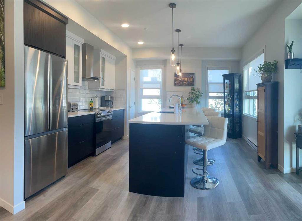 Stunning, spacious, beautiful Condo Apartment built in 2022 by Cedarglen living Inc! This bright and spacious 2-bedroom, 2-bathroom unit on the Main floor features an open floor plan with an extensive island in an upgraded kitchen, with stainless-steel finished state of the art appliances that includes a drawer style microwave in the massive island, designer cabinets with plenty of drawers, quartz countertops, a dream for the hidden chef in you. Sleek wide luxury vinyl plank flooring through out the entire suite, custom in-suite laundry with cabinets, quartz counter and upright freezer maximizing your space. The master bedroom has ample room for a king size bed, walk in closet and loads of ensuite upgrades. Second bedroom is unique and a must see to appreciate the insightful design. Large bright windows, 9-foot ceilings, electric baseboard heating, and air conditioner to keep you cool in the summer. Enjoy a low maintenance condo lifestyle that has everything you need. The 105 sq ft balcony comes equipped with a natural gas barbecue line and a North-East view on the quite side of the building. This unit has one titled underground parking spot. Enjoy relaxing walks in the beautiful park and pond close by. Walking distance to plaza that has restaurants, grocery stores, gym, medical, pharmacy, dentist, and many convenient merchants to enjoy. Quick and easy access to Stoney Trail and 15 min from the Calgary airport. This amazing pet friendly Condo is available for a quick possession. Don’t miss out on this gem, book a showing today and see what makes Carrington Plaza a great place to call home!