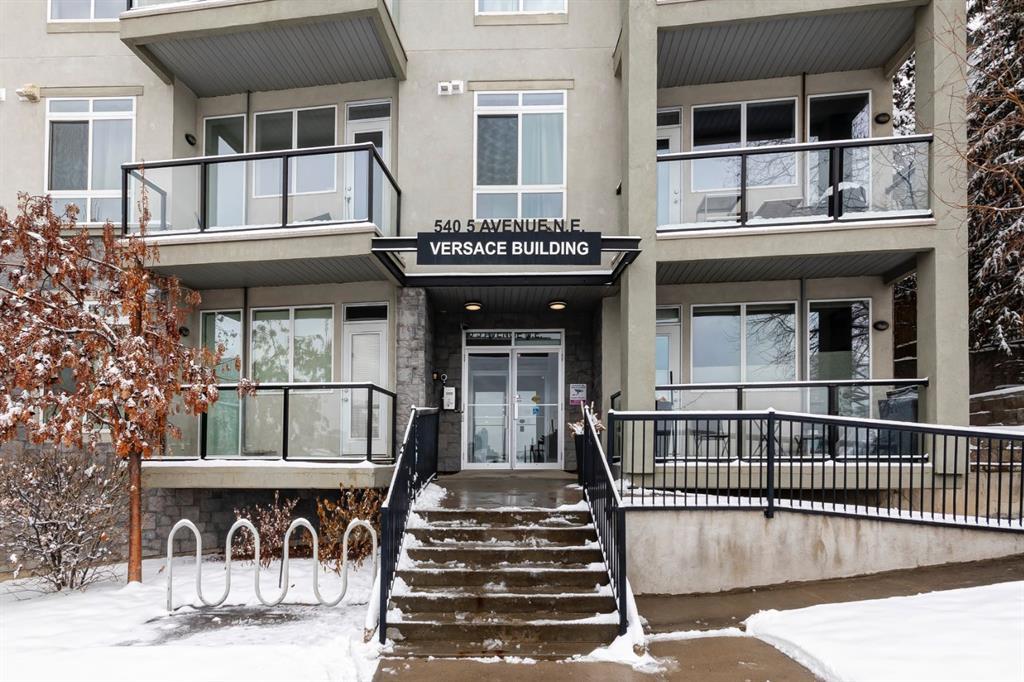 Enjoy the CITY VIEWS this Renfrew location offers! Located on the hillside connecting between Bridgeland & Renfrew, this corner unit in the VERSACE building offers a unique inner city 2 bedroom + 2 bathroom condo. The interior finishes on this unit are exceptional. 9 foot ceilings create an open feeling and the massive windows allow the natural south light to pour in. Functional kitchen with white shaker cabinetry, tile backsplash, quartz counters, stainless steel appliances + over the range microwave frees up counters! The smart layout provides both defined living + dining rooms, complete with modern laminate flooring. Balcony access directly off your living room is perfect for relaxing outdoors, enjoying the view & complete with gas line for BBQ. Generous sized primary bedroom with walk-in closet functional California Closet builtins + 4 pc ensuite! 2nd Bedroom (den) located on the opposite side of unit features a large glass block window (non-opening) & functional closet. Secured underground TITLED PARKING. Remote controlled blinds + smart controlled light switches on many of the ceiling light fixtures. This central location is complimented with many restaurants, shops & walking adventures - all within a quick commute to downtown or major roadways. This premium corner unit ticks off all of the boxes, come see for yourself to truly appreciate the VIEWS!