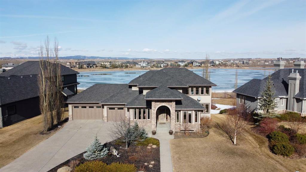 This unique, custom-built one and a half story layout provides a voluminous living area with soaring ceilings and split bedrooms with Primary bedroom located on the main floor offering greater privacy and flexibility. Perfect for aging in place, this forever home is ideal for families, empty nesters, and retirees alike. Positioned perfectly to capture the majestic mountain and lake views, this home is perfectly positioned on an expansive 1/2 acre lot in the exclusive Estate Community of MonTerra on Cochrane Lakes. Upper floor features a bonus room, two bedrooms, and a full bathroom. Perfect for a growing family, this floor plan provides privacy along with a designated space for young adults or guests. The home is awash with light from the many NW facing oversized windows throughout all levels, showcasing the spectacular views. The gourmet kitchen is the heart of this home, including oversized, knotty alder cabinetry, decorative wood hood fan and granite counters tops. Appliances include Sub Zero fridge, Viking 5 burner gas cooktop, Dacor wall oven, and Miele dishwasher. Staying organized is easy with the convenient & roomy walk-through pantry, which leads to a spacious back entrance and fully finished triple garage. Architectural features include a formal dining room with tray ceiling, curved open rise staircase with wrought iron railing, custom built, solid 8’ interior doors and elegant coffered ceiling. Retreat to the Primary bedroom and find tranquility in the views of sunsets and mountains reflecting off the lake, or relax and rejuvenate in the steam shower and soaker tub in the spa-like ensuite. The fully finished walk out basement includes two more bedrooms, two zones of in-floor heating, a wet bar with built in cabinets, a theatre room with a projector, and a spacious games/recreation area, which has recently been updated with luxury vinyl plank flooring. Walk out on to a perfectly landscaped oasis of a backyard, where maintenance is a breeze with underground irrigation. Keep your pets safe and secure with the already installed invisible fence system. Miles of pathways circle the lakes and weave throughout the community providing incredible scenery for walking, while common area gazebos, playgrounds, and ice skating brings the community together all year round. Garbage removal included in condo fee- recycling optional & paid separately. Water: Horse Creek Water Co-op includes sewer. interior of this beautiful home features fresh paint, newly refinished hardwood floors, tile, and new carpet. The only thing left to do is move in & start your next chapter!