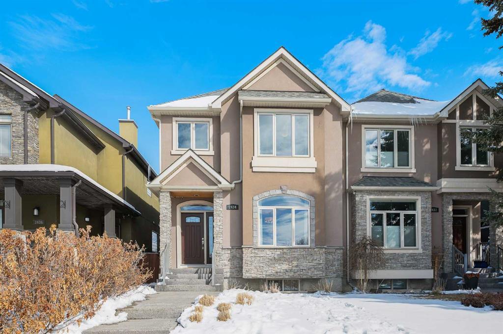 Located in highly-walkable Marda Loop, a beautiful 3+1 bed, 3.5 bath 2-storey home with over 2600 sq ft of living space and a DOUBLE DETACHED GARAGE. The main floor features a bright and airy floor plan, foyer with front-entry closet, south-facing sitting room, French Provincial-style kitchen with ceiling-height cabinets, pantry, stone counters, pot filler, apron sink, and tons of prep and storage space. The living room has a stunning fireplace with built-in cabinetry, and the mudroom has ample storage for jackets and winter gear, plus you’ll find a 2-piece powder room tucked away off of the basement stairs. Notice the little touches throughout the main that add elegance, such as crown moldings, flush-mount lighting, archways, and glass paneled cabinet doors. Upstairs, the primary suite features a 5-piece ensuite with a soaker tub, large glass-walled walk-in shower, dual vanities and a separate water closet. The walk-in closet is large, with custom built-in cabinetry, with a good mix of rods and drawers. The bedroom itself features an alcove with side windows for additional light and flush-mount ceiling lights. The laundry is conveniently located on the upper floor, with a countertop and cabinets. Two more bedrooms, both with south-facing windows, and a 4 piece bath complete the upper level. The basement features a large 4th bedroom, and a 4 piece bath, along with a recreation room, and a storage room that is separate from the furnace/utility room. The back yard is fully fenced, with access to the detached garage and back-lane, a wood deck, garden spaces, and a stone patio. A short walk to the amenities of Marda Loop, including restaurants, entertainment, retail/grocery, and great access to transit plus an easy commute via Crowchild Trail or Glenmore Trail. Mount Royal University, Calgary Arts Academy, highly-rated schools, plus many parks and trail systems are nearby.