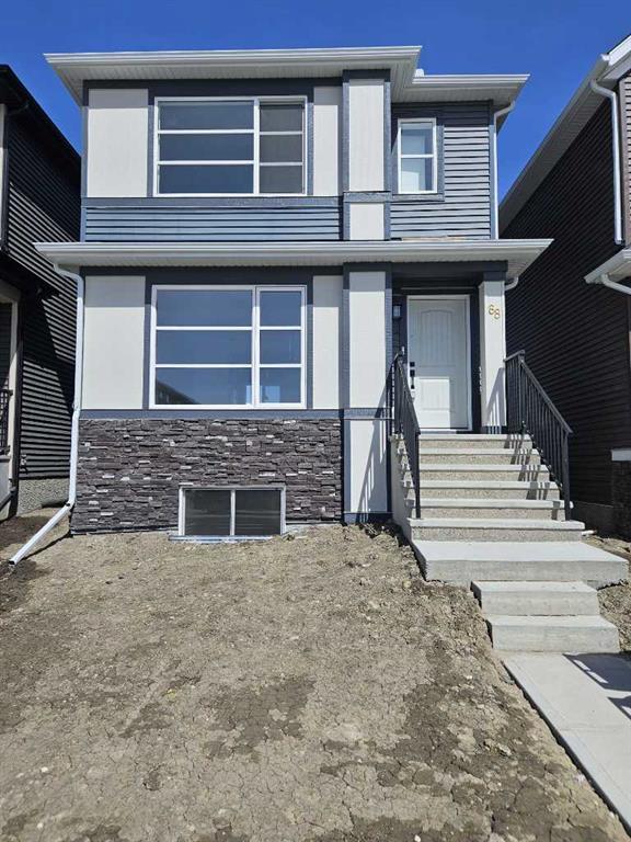 Welcome to the BRAND-NEW HOUSE in the fantastic and desirable community of Cornerstone. This Beautiful Modern home has everything you need zero maintenance SOUTH-FACING. There are many planned retail stores, banks and restaurants that are steps away from this property. Also, mins away from the new planned Calgary C-train line. Upon entrance, you'll notice a nice size closet and a bright living space with large windows that are perfect for cozy gatherings with lots of natural light! 9 FOOT CEILINGS throughout the main level. The open concept kitchen offers fantastic upgrades such as beautiful quartz countertops, upgraded kitchen cabinets, upgraded carpet underlay, Vinyl plank flooring, Stainless Steel appliances, an upgraded backsplash in the kitchen, timeless cabinetry, and a double sink. Portlights throughout the main level. You will find 3 bedrooms, and a laundry closet on the upper level. The primary suite is fit for a king or queen with a 3 pc Ensuite addition to a walk-in closet. Easy Access to Stoney Trail/Airport/Cross iron Mall/School nearby/Grocery Store Etc.