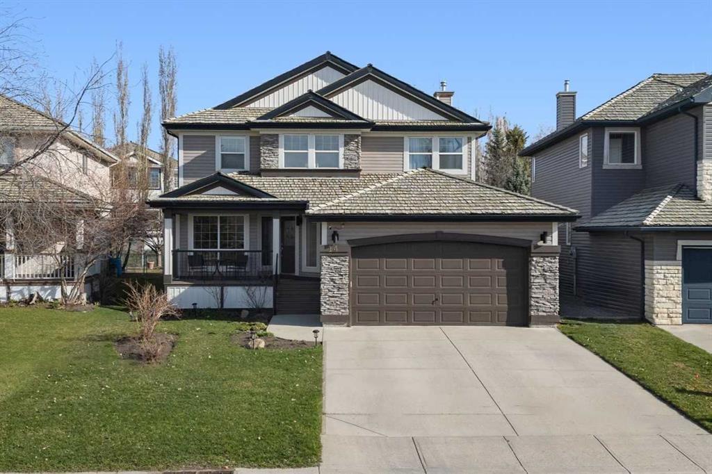 Elegant 4-bedroom family home in the SE lake community of Chaparral. Situated on a peaceful cul-de-sac, this property boasts a beautifully landscaped backyard complete with a spacious deck and a covered pergola, creating an idyllic retreat that backs onto a SEMI-PRIVATE PATHWAY leading to a shared dock and greenspace by the lake. Inside, the residence is equally impressive, featuring hardwood and tile flooring, and an oversized double garage. The main floor welcomes you with a versatile front flex room, ideal for an office or music room, and flows into a generous living room adorned with a cozy three-sided gas fireplace. Adjacent to this, the dining space opens to a stunning kitchen, outfitted with granite countertops, maple cabinetry, and modern stainless steel appliances. The deck, accessible from the dining area, extends your living space outdoors. Upstairs, the home presents four bedrooms, including a luxurious master suite with a renovated ensuite bathroom, boasting heated tile floors, a custom-tiled shower with a heated bench, and a walk-in closet. Adding to the allure, the finished basement provides a large family room with gas fireplace, a rec/games room, and a wet bar, perfect for entertaining. There is an existing rough-in for an additional bathroom & several large windows should the need for adding an extra bedroom arise. The charm of the house extends to the covered front porch, adding a welcoming touch. Located close to top-rated schools, shops, and restaurants, this home & location is truly special – and the lifestyle your family has always wanted!