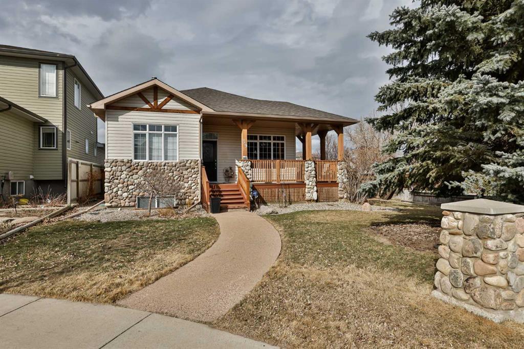 Welcome to 39 Grand River Blvd, a property nestled on its own side street off the main Boulevard, adorned with mature trees in the sought-after community of Riverstone. This neighborhood offers proximity to St. Patrick’s Fine Arts Elementary School, paved walking paths, ponds, and stunning Coulee views. The corner lot boasts a spacious wraparound front veranda, providing ample privacy with its large, mature evergreen trees. Upon entering the home, you are greeted by a striking lofted two-story layout, with an impressive staircase stealing the spotlight. To the left, you'll find a front office or bedroom with a full bathroom featuring a tub, shower, linen closet, and unique ceiling detail. Further inside, a generous living and dining room area divided by a gas fireplace with mantle detail to the 18’ ceiling . On the other side, an updated kitchen with new countertops, sink, and faucet merges seamlessly with a cozy nook area. The home also features a rear attached double car garage, a newer back deck, gazebo, shed, and exposed aggregate patio area in the backyard. Upstairs, the master bedroom retreat boasts a spacious layout with a large soaker tub, separating the walk-in closet, and ensuite, and even offering room for a sitting area. The basement comprises a large living room, two bedrooms, a full bathroom, and a laundry space equipped with ample storage, a new hot water tank, central vac, air conditioning, newer appliances, and blinds. If you're in search of a fantastic four-bedroom family home with three full bathrooms, reach out to your favorite realtor today.