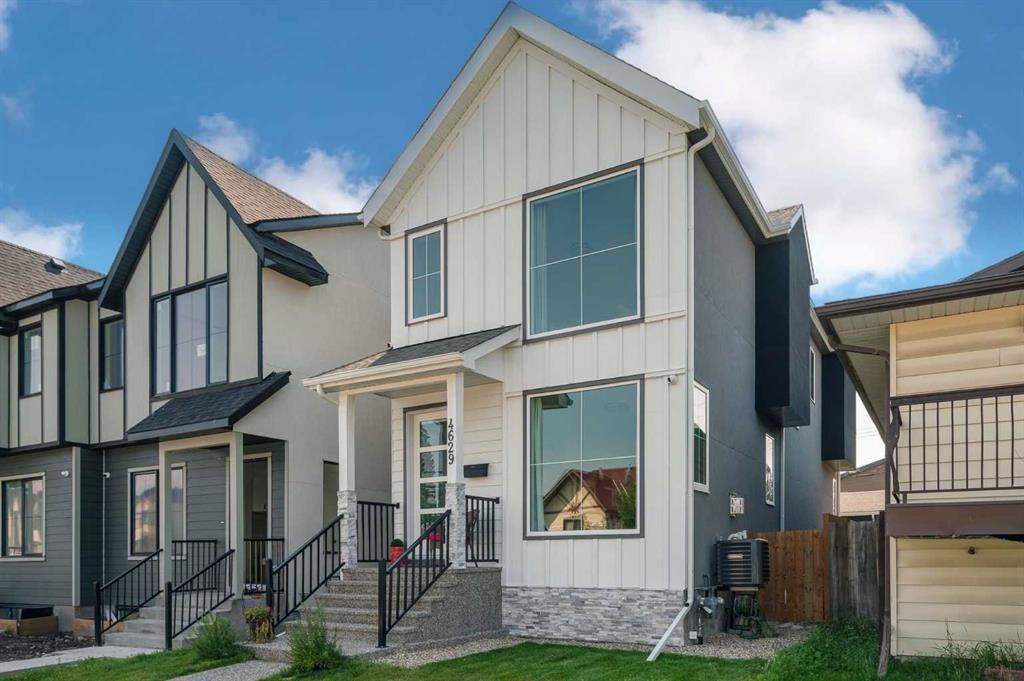 This stunning infill is located in the heart of Bowness and features 5 bedrooms, 3.5 bathrooms, and over 2,600 square feet of developed living space over three levels. The main level offers an open concept layout with a wall of windows at the front and rear of the home that allows natural light to flow throughout the home all day. The living area is situated around a gas fireplace and leads into the kitchen which features stainless steel appliances, full-height cabinetry, white quartz countertops, and a large center island with double sinks and a breakfast bar. The kitchen overlooks both the living area and dining area, making this the perfect space to entertain friends and family. The main level is complete with a 2-piece bathroom and a mudroom at the rear of the home. The upper level offers 3 bedrooms, 2 bathrooms, and a full laundry room for added convenience. The spacious primary bedroom features a vaulted ceiling, a walk-in closet, and a 5-piece ensuite bathroom with a double vanity, a large soaker tub, a walk-in shower, and a skylight allowing in natural light. The lower level is fully finished and features a large rec. room with a wet bar, as well a 4-piece bathroom and two additional bedrooms - perfect for guests, a home office, or workout studio. The sunny South-west facing backyard offers a beautiful deck and plenty of green space to enjoy with the family. Additional features of this home include solar panels that reduce your monthly utility costs, central air conditioning to keep you cool during the summer months, and an insulated, double detached garage to keep your vehicles secure and out of the snow in the winter. Centrally located in the sought-after community of Bowness, this home is only steps from nearby amenities and the Bow River walking paths and offers quick access to Highway 1 and Stoney Trail for quick commuting.
