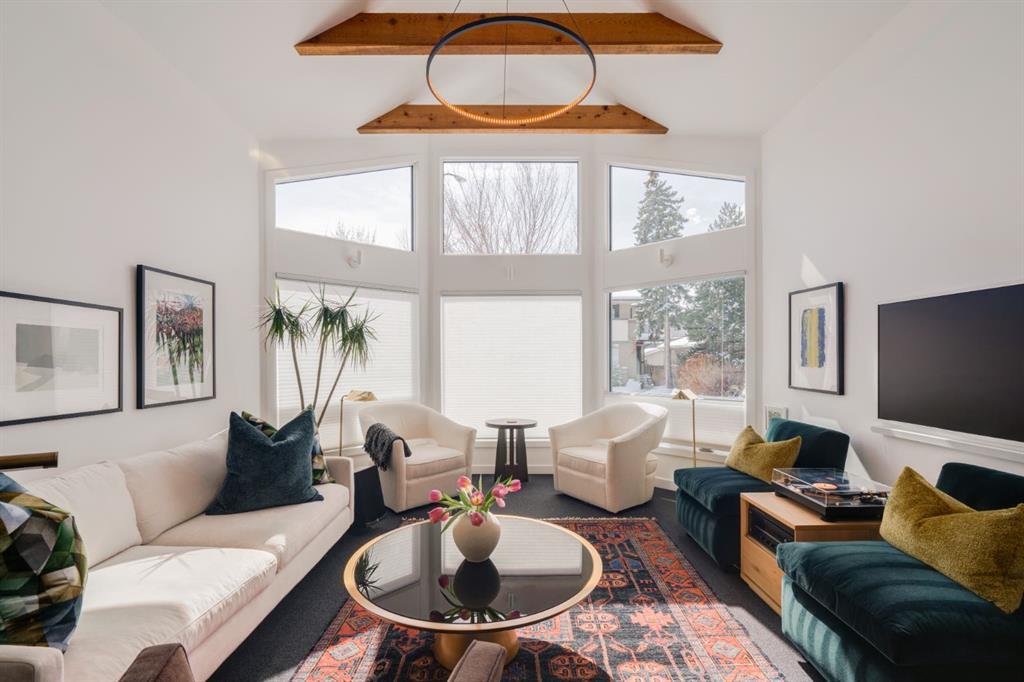 This lovely 4 bedroom, 3.5 bathroom home owned by its original owners, was designed in collaboration with Calgary architect Ron Goodfellow and designer Doug Cridland in 1981. Extensive updates were completed from 2019-2023 with Sandro Roome Sandrin of Sandrin Construction and designer Martine Ast, making this home a beautiful example of intentional design. New Zealand wool carpets, heated porcelain tile floors, natural oak hardwood, custom draperies, and new Lux triple glazed windows are just some of the luxury materials integrated into the space. Featuring spacious, light filled principle rooms and modern design throughout, the home offers a functional open floor-plan that easily flows from the living room to the kitchen. The property comes complete with custom built-in’s, vaulted ceilings on the main and upper floors, 10 ft. ceilings in the basement and newly updated HVAC, windows and exterior fencing. Guests are welcomed via the private entrance to the foyer and main living space showcasing wood beams, vaulted ceilings, wood burning fireplace and large windows. The dining area is apt for dinner parties large or small and transitions into the updated kitchen with breakfast bar, stainless steel appliances, exposed wood shelving and gas range. Upstairs, the primary suite is adorned by a large 5pc ensuite bathroom with shower, bathtub, dual vanities and vaulted ceilings with large skylight. The additional bedroom has its own ensuite and full wall of built-ins. Downstairs, the fully developed basement is perfect for guests, with a 3rd and 4th bedroom, full bathroom and laundry and storage spaces. This exceptional property is located on a quiet cul-de-sac, with private, treed courtyards-front and rear, and single detached garage with alley access. You’ll love morning strolls to the Lazy Loaf and Kettle, watching the seasons transition along Memorial Drive and the Bow River and summer hikes through Edworthy Park and the Douglas Fir Trail. The proximity to top schools, hospitals, downtown, University of Calgary and convenient freeway access ensures easy commuting to other parts of the city and beyond, providing a seamless experience for residents and families.