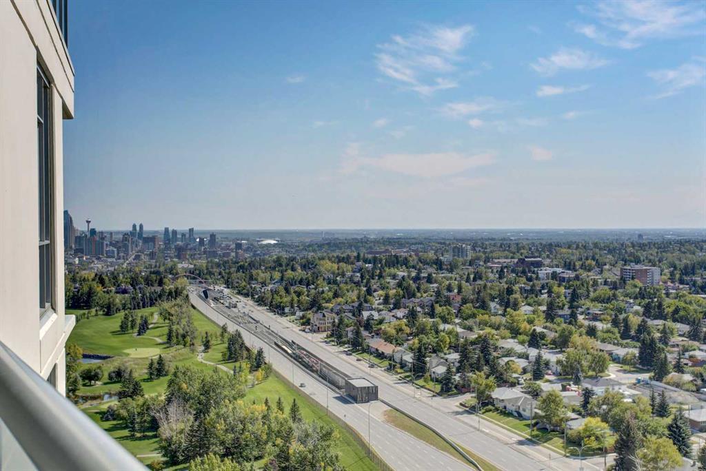Presenting this bright 2 bed, 2 bath condo with 2 TITLED PARKING STALLS & flexible possession! Perched on the 23rd floor, this gorgeous unit offers stunning south & west mountain views from the dramatic floor to ceiling windows. The foyer greets you with ceramic tile floors & double closet. The kitchen features dark cabinets, granite counters, full tile back splash, under mount lighting, flat cooktop stove & over the range microwave with a terrific eat up central island. Blending into the spacious open living room, there is a corner fireplace & a full width (23ft x 5ft) balcony to enjoy. The bedrooms offer generous space & the main 3pc bath boasts granite & full tile shower surround. The primary features a full 4pc bathroom & generous space & light. Offered in a desirable location steps from LRT transit & shopping, this luxurious condo also benefits from an amazing amenities building with a pool, hot tub, games room & gym. Ideally close to commuter routes, this offers everything for the discerning buyer or investor. 24hr on site security ensures excellent safety and building security. Flexible possession is available. Welcome home!