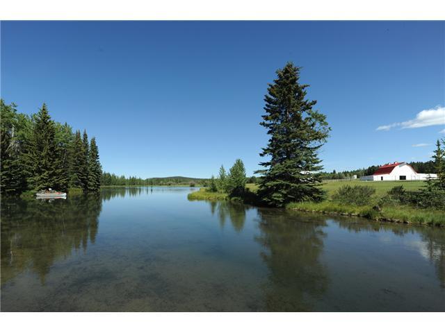 This is a rare opportunity to be part of a unique and exclusive recreational property. At this development, 26 residents enjoy the use of 480 acres with 4 stocked lakes for fishing and boating; horse pastures, paddocks, and barn; a trap and skeet shooting range; a heated swimming pool, a sport court, and a community lodge. Each resident also enjoys their own private building site. This 2679 sq. ft. 4 bedroom home backs onto one of the smaller lakes and has a private dock with an octagonal sitting area. Large windows, open areas, and vaulted ceilings contribute to a wonderful sense of living space, and the many decks and balconies extend that space to the outdoors. Hardwood floors, open-beam ceilings, and 2 stone fireplaces create a relaxing mountain-lodge ambience. Newer stainless-steel appliances in the kitchen with Corian countertops, a large walk-in pantry, a main floor laundry, lots of storage spaces, and a steam room in the master en suite add functionality. A vacation retreat, only 20 minutes from Calgary.