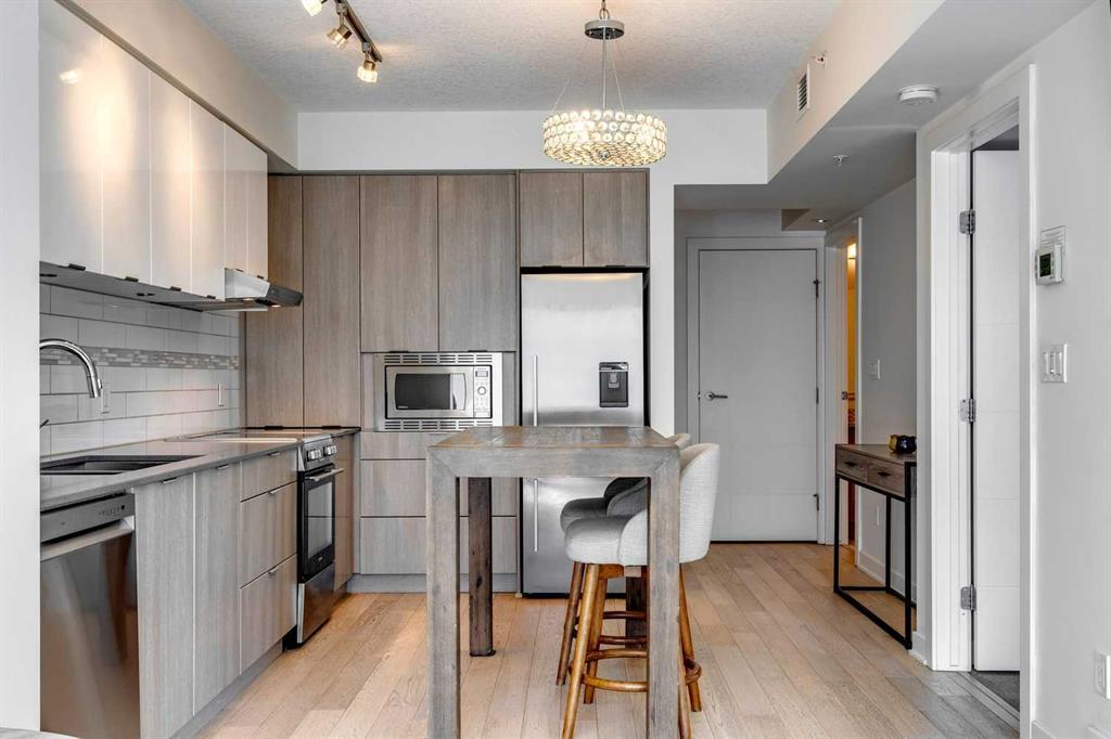 Welcome to this charming one-bedroom suite in the prestigious Vogue building, centrally positioned in Calgary's vibrant West End. This concrete building is AIR CONDITIONED, and the structure of this building is still under warranty and was constructed by the highly esteemed LaCaille Group in 2017. This building is known for its excellent soundproofing and the developer has a great reputation in the industry. Conveniently located just a block away from the LRT, this property lands within the “TD free fare zone” meaning you can ride the train downtown at no cost. If you work downtown, this would equate to a free public transit commute. Furthermore, the downtown West End location affords unmatched proximity to Calgary's bustling cityscape, while also providing convenient access to the scenic Bow River, Princess Island Park, and the extensive network of bike pathways, catering to avid outdoor enthusiasts. Embrace the essence of city living with easy access to Kensington's eclectic array of shops, exquisite dining options, and dynamic cultural attractions. The suite itself is flooded with natural light throughout the day, the glossy kitchen cabinetry extends to the ceiling, and is one of the few layouts in the complex where the patio door is accessible from the living area. This original occupant suite has been meticulously cared for by one owner since conception, and pride of ownership is evident throughout. Freshly painted and cleaned, this turn key unit is ready for quick possession and the underground parking stall is in a great location close to the elevator. Vogue epitomizes executive living, boasting an array of standout amenities including a grand lobby, full-time concierge service, a comprehensive fitness facility, recreational spaces such as ping pong and billiards rooms, a spacious party room with kitchen facilities, an exclusive owners' lounge, meeting rooms, bike storage, a dog wash area, and ample visitor parking. With secured visitor and underground parking facilities, as well as top-tier security measures, this condominium prioritizes safety and hassle-free living. This property would make a great choice for a first-time home buyer, student or executive rental.