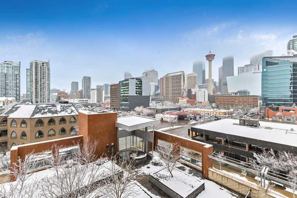 Experience urban living at its finest in Nuera, a contemporary high-rise located just steps from the bustling heart of the city and Stampede Grounds. Enjoy breathtaking views of the Calgary Tower and downtown skyline with stunning sunsets from the comfort of your SW corner unit, boasting 2 bedrooms and 2 bathrooms, in arguably the best layout available with the bedrooms at separate sides of the condo. Floor-to-ceiling windows with Roller Blinds fill the spacious living and dining areas with natural light. The large kitchen features sleek Espresso Cabinetry, a huge island / breakfast bar, Quartz countertops, and stainless steel appliances. Step out onto the covered West-facing balcony to unwind and watch the sunset. Nuera features a well-equipped gym and full time concierge / on-site security. Enjoy the vibrant downtown lifestyle, just steps from Sunterra Market, Starbucks, restaurants, Starbucks, Stampede / Saddledome, and the LRT.