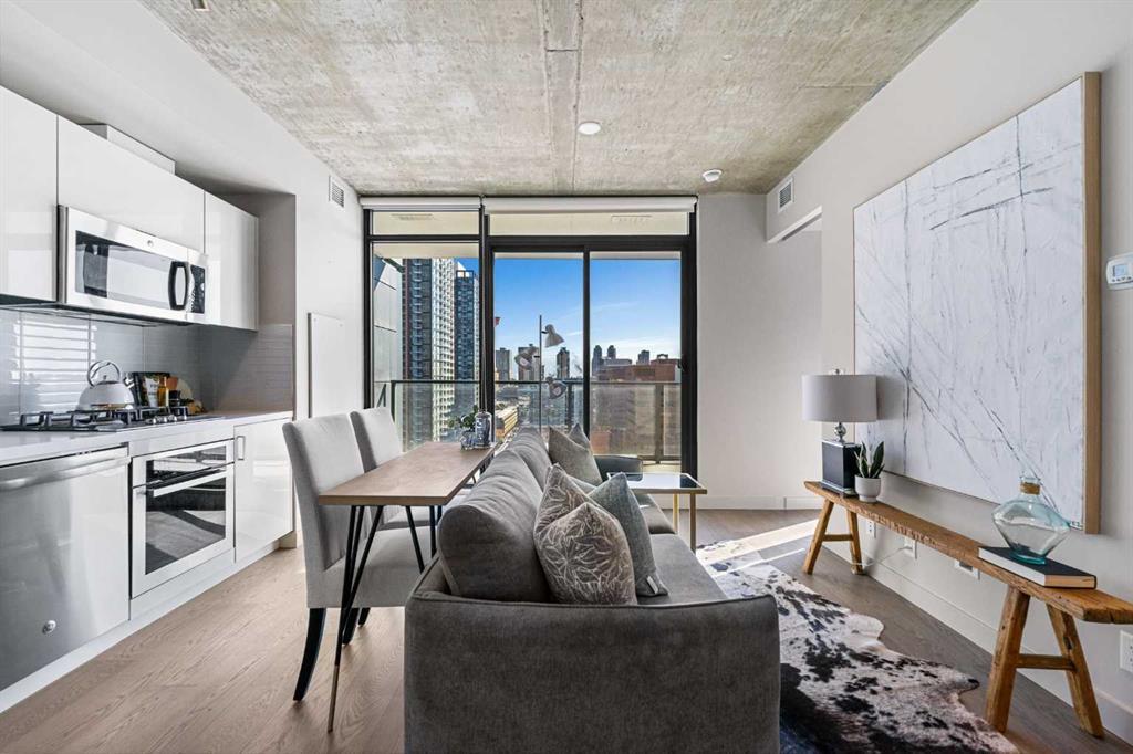 Experience modern urban living at its finest in Calgary's vibrant Beltline district with the 6th and Tenth building. This exceptional high-rise stands out with its sleek design and prime location, offering an outstanding investment opportunity. Calgary's apartment condo market is currently thriving with a robust 17% year-over-year growth, and this property has the added benefit of no land transfer tax. Unit 907, situated on the 9th floor, is a beautifully appointed 415 sq ft residence designed for those who value both convenience and style. This one-bedroom, one-bathroom unit has been freshly painted and boasts an east-facing orientation, providing residents with breathtaking views of the iconic Calgary Tower and the city's skyline. Natural light floods the space, creating a warm and inviting atmosphere for your morning coffee. The modern-industrial aesthetic is highlighted by 9' exposed concrete ceilings and walls, giving this unit a unique charm and character. Despite its compact size, the thoughtful layout maximizes the living space, ensuring comfort and functionality. Central air conditioning is a standard feature, keeping the environment cool and pleasant throughout the year. Living at 6th and Tenth means access to premium amenities on the second floor, including a fully equipped fitness center, an expansive terrace with an outdoor swimming pool, and a shared kitchen/party room – perfect for entertaining guests or enjoying a quiet day at home. This building also allows short-term rentals (Airbnb/Vrbo, etc.), providing flexibility for those seeking ultimate versatility with their investment. Unit 907 at 6th and Tenth represents a rare opportunity to own a piece of Calgary's vibrant urban landscape. Its unbeatable location, combined with the building's luxurious amenities and the unit's exceptional features, make it a highly desirable choice for anyone seeking the best of city living. Contact your real estate professional today to explore the possibilities that await in this remarkable residence.