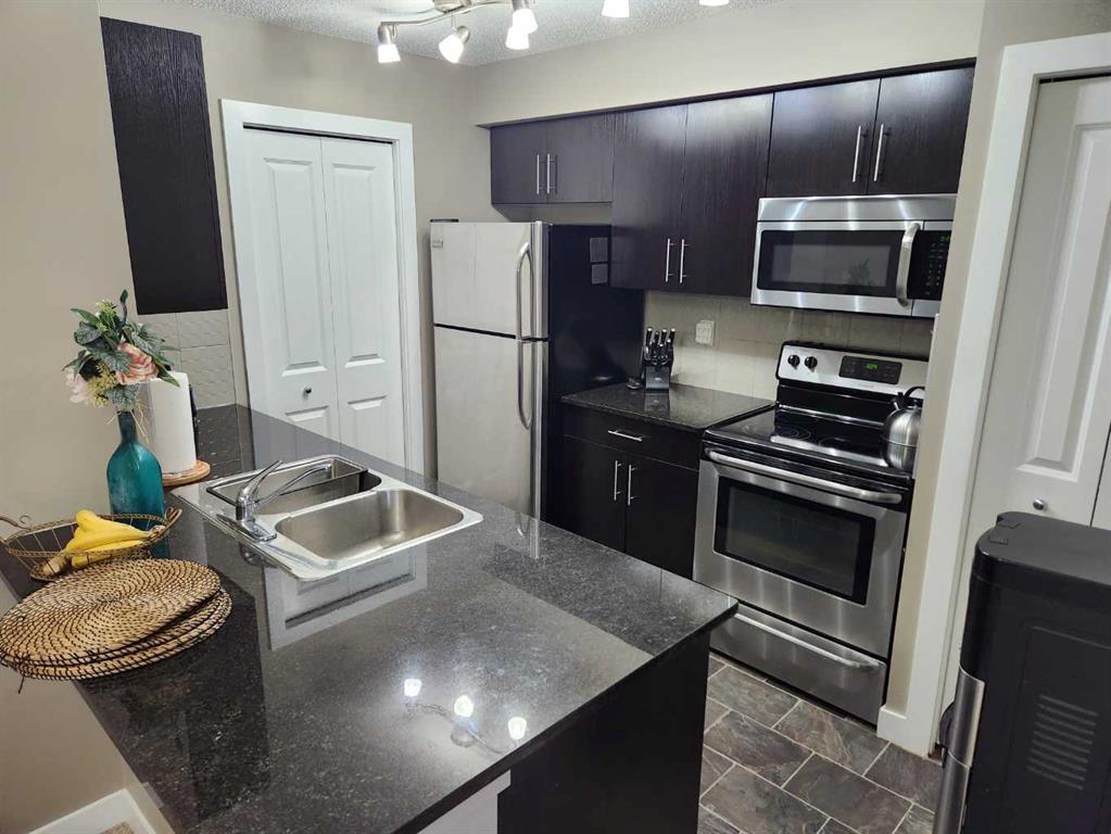 Original owner unit in fantastic condition. This great 2 bdrm unit shows pride of ownership. Enter this 2nd floor unit and you find a nice sized 4 piece guest bathroom, lots of front closet space fo your coats and shoes. The kitchen with SS appliances and granite counter tops is spacious and has an oversized eating ledge if you prefer to eat at the island area. The adjoining dining area makes for a great ambience in the unit. The LR area is graciously sized and also has a very large covered deck perfect for your patio furniture and BBQ. Mbdrm is large and has it's own 4 piece ensuite and his/her closets. The 2nd bedroom is also a very nice size and easily fits a queen size bed. There is a large storage room off the kitchen and hosts the washer/dryer. A titled parking stall in the heated and secured parkade will make you happy year round. Tons of great shopping in the area, schools not too far off and great access to Macleod Trail and Stoney Trail.