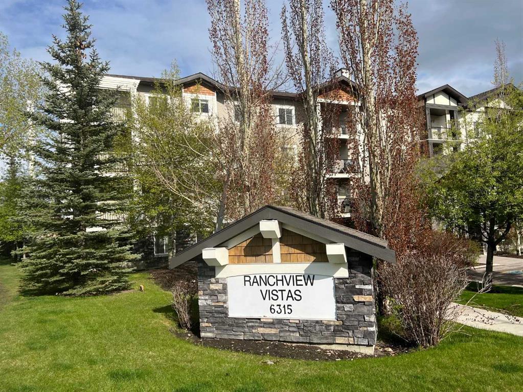 Welcome to your new home in the family oriented welcoming community of Ranchlands. This large and functional 2-bedroom, 2-bathroom condo in Ranchview Vistas built by "Cardel" offers a perfect blend of comfort and convenience. As you step inside, you have a large entry room with plenty of space for groceries or a bike. Foyer closet is conveniently located next to a full bath. Further you will see a functional kitchen with plenty of granite counter tops and lots of cupboards. Very convenient plan with dining room combined with living room, where you're greeted by a corner gas fireplace that creates an inviting ambiance for cozy evenings. Enjoy casual meals at the breakfast bar. Light colour hardwood flooring and granite countertops add a touch of elegance to the space. Bedrooms are completely separate for added privacy. Very handy in-suite laundry and underground parking stall provide added convenience. Plus, you will have an ample space for your belongings with added storage locker. With apartment location on the main floor it has that added convenience of stepping out on your balcony and be able to have a peaceful retreat or your flower pot hobby! Surrounded by lots of green space, located within walking distance to the playground, nearby tennis courts or hop on the bus route, school within close proximity - all those great amenities are just steps from your door. With the Crowfoot LRT station a short 10-minute walk, commuting is a breeze. Plus lots of shops and places to eat nearby. This condo has been lovingly maintained and is currently vacant to accommodate quick possession. So whether you're a first-time buyer or investor, or may be looking to downsize - this is the perfect place to call home.