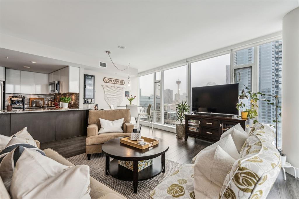 Experience breathtaking north views of the Bow River and west views of downtown Calgary from this stunning corner unit condo on the 15th floor of the Evolution-Pulse Tower. See the Calgary Tower, TELUS Sky, the Central Library and more, with floor to ceiling windows, the open floor plan is highlighted by an amazing open an contemporary living a dining room. Enjoy all the ever changing views of the City during the day and at night! Enjoy working in the elegant chef's kitchen with tasteful granite countertops and upper white cabinets, enjoy morning capaccinos, sunset cocktails or glasses of wine while preparing dinner. Also a sundeck with expansive river views! Central air conditioning for those hot days of summer. The primary bedroom boasts river views and a luxurious 5 piece ensuite bathroom, while the second bedroom and 3 piece main floor bath offer ample space for guests. With laundry in the unit, indoor secured parking, and extra storage, this complex offers plenty of options for convenience. Amenities include a fitness centre with deluxe sauna, recreation and party room, and roof top picnic area with grills. Located steps away from the Central Library and the Music Centre, and with easy access to walking and biking pathway system, amazing restaurants, shops, and services, this is truly an amazing place to call home! Original owners since the complex was new!