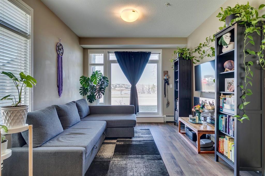 Stunning 1-bedroom, 1-bathroom end unit, pond facing condo located in the desirable community of New Brighton SE Calgary. Open-concept layout that seamlessly integrates the living, dining, and kitchen areas. The living room is bathed in natural light with extra window on the side, creating a warm and welcoming atmosphere for relaxation and entertainment. Adjacent to the living area, sliding glass doors lead to your sunny NW facing balcony, where you can enjoy stunning views of the pond while sipping your morning coffee or unwinding after a long day. It's the perfect spot to soak in the tranquility of your surroundings. Retreat to the spacious bedroom, offering a peaceful haven for rest and rejuvenation. The adjacent bathroom exudes modern elegance, featuring a sleek vanity, a deep soaking tub, and contemporary fixtures. Condo fees include heat, water, gas and sewer.
