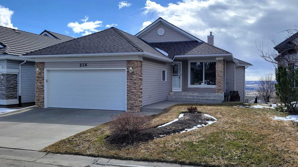 Welcome to 236 Rocky Ridge Bay NW. This 1540 sq ft bungalow has spectacular panoramic views from the downtown skyline through the Paskapoo slopes to the majestic Rocky Mountains. The walkout home backs onto a large green belt with access to a large network of walking and cycling paths. Through the front entry is the large den with glass french doors. The central kitchen has a big island, white appliances, corner pantry, and a bright skylight. Through the dining area is the south facing patio, boasting fantastic views. A 3-way gas fireplace divides the dining area and the spacious living room with built-in cabinets. The primary bedroom has a walk-in closet and a 4-piece en-suite with a soaker tub and a separate step-in shower. Completing the main floor plan is the second bedroom, a 4-piece bathroom and the main floor laundry room. The lower level has a hobby room, a 4-piece bathroom and an enormous entertainment/games room leading to a brick patio and south facing yard. The basement has plenty of storage and space for a workshop. The furnace and A/C system were installed approximately 3 years ago. Large front window was replaced 5 years ago, patio doors were replaced 2 years ago. This home does not contain Poly-b plumbing. Across the front street are several convenient parking stalls for guests. This very clean and well-maintained home is a must see.