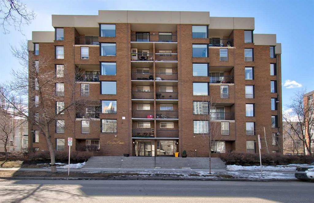 Welcome to Executive Estates! Located on a peaceful street right across the road from Connaught School, access to anywhere is quick and convenient. This beautiful and secure building has a super clean common area leading up to the unit on the 4th floor. Spacious condo is dominated by hardwood and ceramic tile flooring. Kitchen includes tasteful maple cabinets along with granite counter tops, stainless steel appliances, and under mount sink. Living room boasts plenty of natural light with sunny south exposure along with access to the private balcony, making it perfect to enjoy your morning coffee. Completing this well kept unit are a good sized bedroom, full bathroom, in suite laundry, assigned storage and parking. Steps to downtown and all restaurants/shops on 17th Ave, this is a great opportunity for those looking to get into the market or investor.