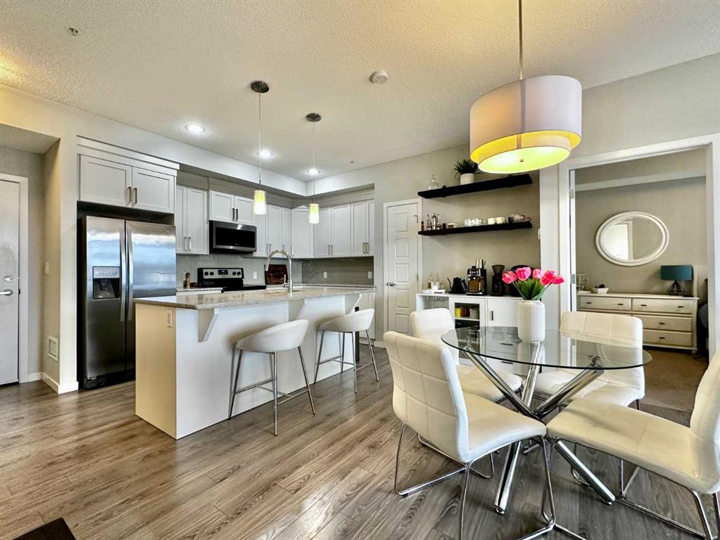 Welcome to this amazing 2-bedroom, 2-bathroom condo located in the modern and quiet community of New Brighton. Offering over 900 square feet of living space, this trendy home provides a comfortable living area in a convenient location. Inside, you'll find modern, practical features such as vinyl plank flooring, granite countertops, and stainless steel appliances. An abundance of windows help fill the open concept living space with natural light, creating a warm and inviting home. Enjoy the convenience of in-suite laundry and ample storage. Outside the balcony overlooks the landscaped courtyard, perfect for relaxation or outdoor dining. Never worry about parking as this unit has an underground parking stall in the parkade. This property is well situated with nearby schools, shopping, restaurants, and the South Health Campus with easy access to main roads. Residents can take advantage of the amenities at the New Brighton Clubhouse, offering various recreational activities. Book a showing today and be prepared to fall in love with the New Brighton community.