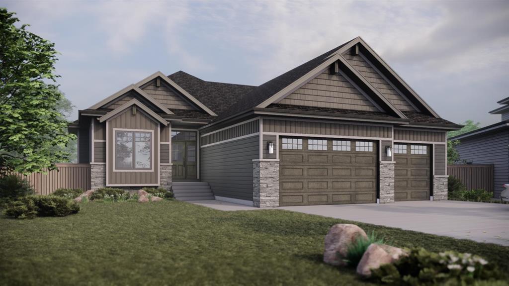 Welcome to this exquisite new construction Lakeside bungalow, where modern elegance meets cozy comfort. As you step through the front door, your greeted by an inviting open concept layout. The heart of the home is the great room where a stunning fireplace serves as a focal point, creating a warm and inviting ambiance. Natural light floods the space accentuating the beaty of the contemporary design. Adjacent to the great room is the kitchen with ample counter space and a spacious island, ideal for meal preparation and entertaining. The dining area seamlessly connects to the kitchen offering an intimate experience for enjoying meals with family and friends. Retreat to the primary bedroom, a sanctuary of comfort and luxury, complete with a 5 piece ensuite and a walk through closet that leads to the main floor laundry. Additional to the primary suite, there is another well appointed bedroom and bathroom on the main floor, providing versality and convenience for guests or family members. Venture downstairs to the lower level, where you will discover even more space to unwind and entertain. A spacious family room offers endless possibilities for relaxation and recreation, while three additional bedroom and bathroom provide plenty of room for family members, offering versality and space for the growing family. A generous storage area completes the lower level for organizing extra belongings and keeping the living areas clutter free. Finished off with a triple attached garage, and located in a quiet cul-de-sac, this bungalow offers something for the whole family. Photos are renderings only and are subject to change.
