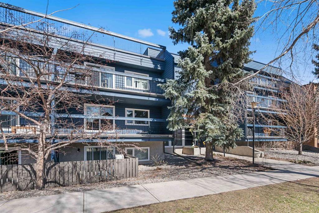 Beautiful top floor END UNIT condo with a huge, South facing private balcony and gorgeous downtown views! This condo has a unique , open floor plan and has been updated with new laminate flooring, updated bathroom and kitchen. The space shows big with an open floor plan and almost 700 square feet of living space. The kitchen walls were removed and a large island installed making this an open, inviting space. The kitchen has been refreshed with new lighting, subway tile backsplash and stainless appliances. The living room and dining room are spacious with city views from every site line. The balcony runs the length of the condo . You will love how private this South facing outdoor space feels! Primary bedroom is a large, roomy space with closet organisers and more beautiful views! Four piece bathroom is updated with new vanity, toilet and custom walnut mirror. Newer stacking washer/dryer are housed in a designated laundry room. There is also a separate storage space next door to the unit. This building has been well cared for with newer windows and patio doors, newer boilers, and new hot water tank. The roof is scheduled for replacement this summer and the building exterior is freshly painted. There is also one assigned , covered parking stall. Secure bike storage is located within the building. Amazing location steps to Rotary Park off leash, tennis courts, wading pool and lawn bowling , an easy walk to downtown, Kensington or Bridgeland