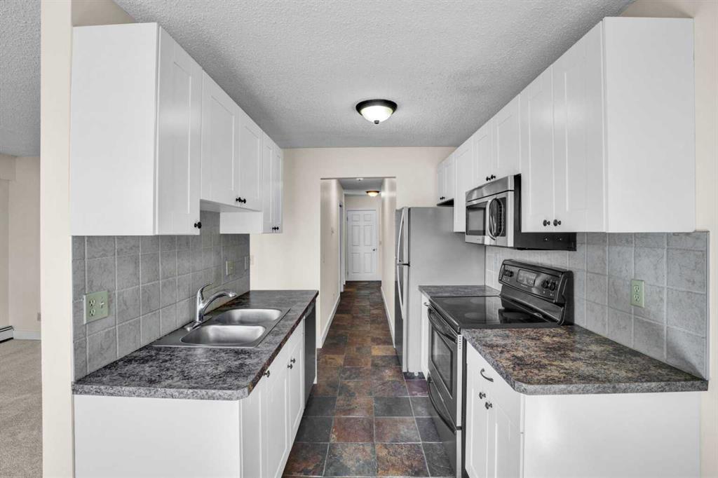 Gorgeous DOWNTOWN VIEWS from this TOP FLOOR beautiful condition condo. This south facing home is filled with natural light, a modern white kitchen with stainless steel appliances, large sized patio doors to a sunny 12' balcony, the living room is very spacious, has great views and a gorgeous corner wood burning fireplace! There are two great sized bedrooms, insuite laundry and slate floors. The downtown location is amazing - QUICK EASY WALK TO DOWNTOWN, all of the trendy Bridgeland restaurants & coffee shops, and the Bow River pathway system! This is a very well managed building with newer windows, balconies, patio doors and a new roof in April 2024!