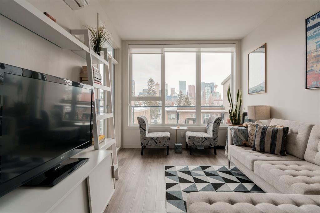Welcome to the TELA in Mission! This stunning 2 bed/1.5 bath unit is perfect for someone who is looking for the perfect blend of comfortable living and the inner city lifestyle. Built in 2017, this is one of the newer buildings in the community. The first thing you’ll notice is the beautifully upgraded finishings including the heated engineered hardwood floors through out. The seamless transition from the kitchen, dining and living areas create a beautiful open concept living space that is highlighted by the large windows and iconic city views. The kitchen is perfect for entertaining with a large island and room for 4 bar stools. The quartz waterfall island, the quartz backsplash and pendant lighting are also upgrades. The kitchen is outfitted with high gloss cabinetry and stainless steel appliances and plenty of storage space. The dining/living space is a good size and allows for multiple options for furniture layouts. The primary bedroom has a large window so you can admire the city views from bed. The full 4-piece ensuite bathroom has plenty of storage and includes a linen closet and features sensor under mount lighting and heated tile floors. The secondary bedroom can be also utilized as an office/den. Off the kitchen is a half bath for convenience. Additional upgrades are the custom built ins in all the closets. Enjoy summer nights and the city views on the covered patio with string lights and a gas hook up for the bbq. This particular unit benefits from the extended L shape patio and allows for additional seating at the bar area. Also included are A/C, in suite laundry, titled underground parking and a separate assigned storage locker. The Tela building is located on a beautiful tree lined street and is walking distance to some of the best restaurants and bars in Calgary. In close proximity are also the c-train, MNP centre, Safeway and the Elbow river & pathways. Find out why Mission is one of the most coveted communities in Calgary with all the amenities you need right outside your door!