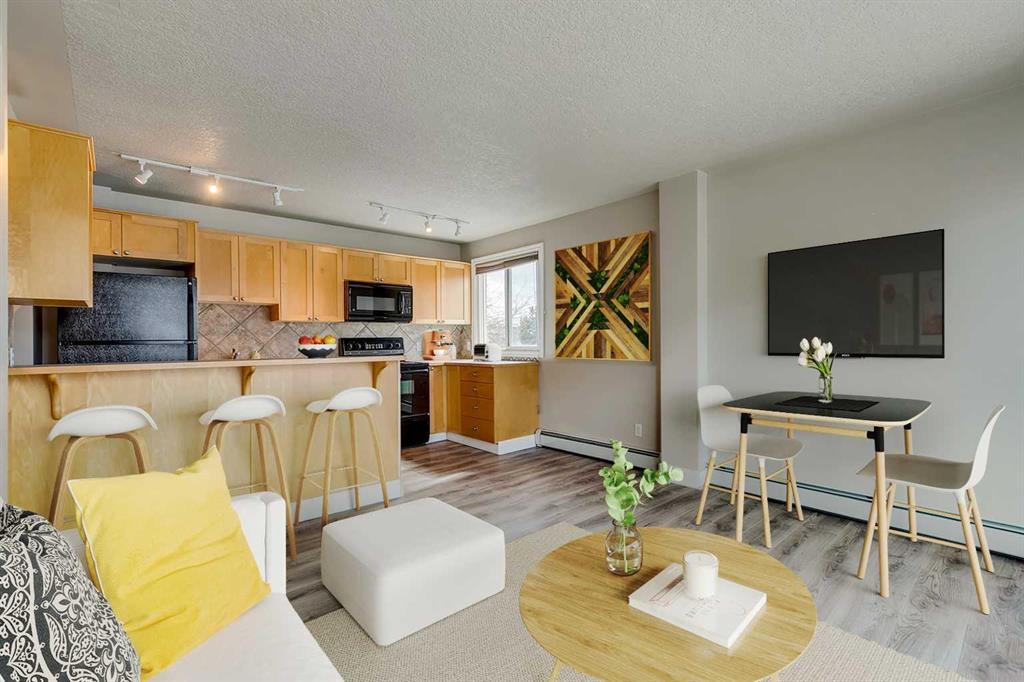 Meet “Bella” - The 1 bed/1 bath corner unit in Sierra Vista on a quiet street in Bankview. Enjoy sunsets from your WEST-facing balcony overlooking the colourful character houses on the street. Inside, the efficient open floor plan offers a bright and comfortable living space with upgraded flooring and large windows. The maple kitchen with black appliances and eating bar has loads of counter space and cabinets including a built-in wine rack. The bedroom with large closet and a full bathroom with tiled tub and shower are just down the hall. Rounding out the list of features is IN-SUITE laundry as well as a COVERED PARKING stall with STORAGE in front. Situated in between 17th Ave and Marda Loop with everything you need at your fingertips, including Starbucks just up the street. Bankview has a lot to offer with several parks, tennis courts, community garden, and an active community association. Quick possession available. Book your showing today!