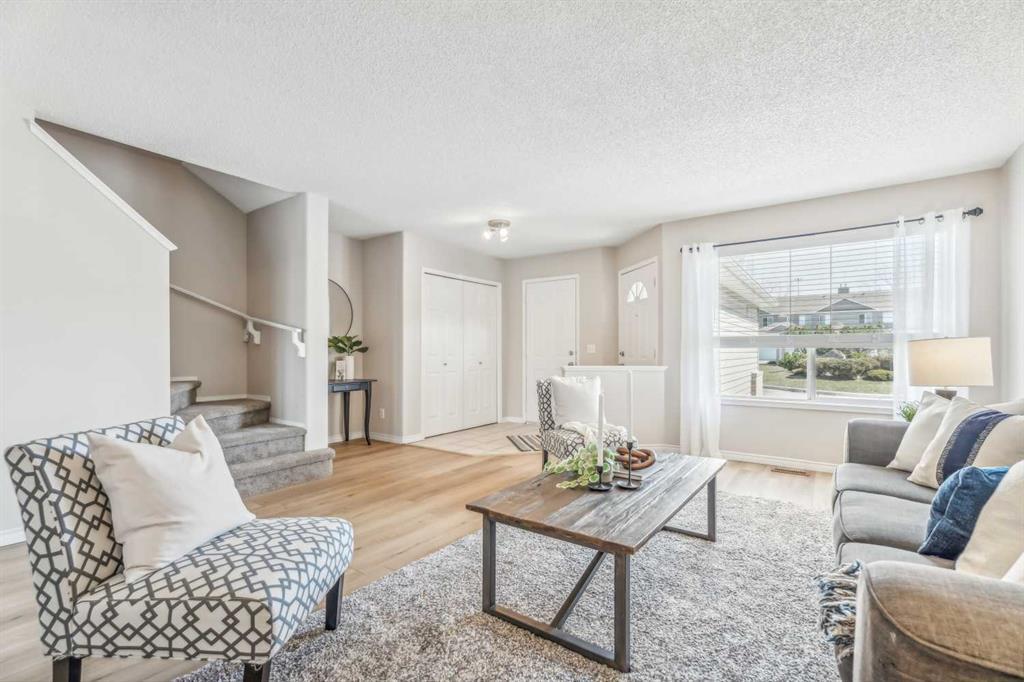 Welcome Home! Welcome to your new oasis! Dive into luxury with this captivating 4-bedroom, 2.5-bathroom townhome nestled in the vibrant heart of Airdrie. Recently revamped with a modern touch, this abode boasts upgraded vinyl plank flooring, plush carpeting, and a fresh coat of contemporary paint that floods every corner with light. Step inside to discover a luminous living space seamlessly flowing from the airy foyer to convenient garage access. Your inner chef will rejoice in the gleaming, chef-inspired white kitchen, complete with an inviting dining nook for delightful gatherings. A convenient 2-piece bathroom and direct deck access make entertaining a breeze on the main floor. Ascend to the upper level to find three generously-sized bedrooms, including a serene primary suite boasting its own ensuite bath. An additional full bathroom ensures ample comfort for family and guests. Downstairs, the partially finished lower level beckons with a versatile bedroom or flex space, laundry room, and abundant storage options. With a single attached garage, extra parking stall, and picturesque greenspace just beyond your doorstep, this home offers both convenience and charm. Enjoy the central location, granting easy access to schools, shopping, Deerfoot Trail, and a swift commute to CrossIron Mills, Costco, and the Calgary airport.
