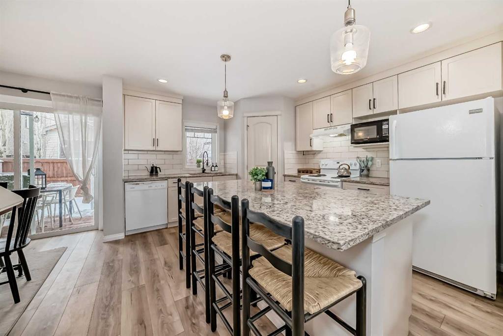 ABSOLUTE STUNNER! This home has it all! FULLY DEVELOPED-GRANITE COUNTERS, LVP FLOORING- BEAUTIFUL UNIT!As you enter this home you are greeted with a large living area, with a cozy corner natural gas fireplace, A DREAM KITCHEN - Large GRANITE ISLAND, with eating bar, white kitchen with white subway tile backsplash, LARGE walk in PANTRY, a dining area overlooking the deck and yard. Upstairs there are THREE bedrooms, 4 piece bathroom, LARGE PRIMARY BEDROOM with SITTING area and WALK IN CLOSET. The basement is FULLY FINISHED with a FAMILY room, 3 piece bathroom, laundry area. The yard has a shed, deck, BBQ line. Located in Chaparral Valley close to FISH CREEH, shops, schools off leash dog park and Blue Devil golf course! There are many visitor parking stalls and 2 titled stalls directly out front! It's Pet friendly with board approval. This development backs onto walking paths, greenspace + pond! This home is well loved and it shows!