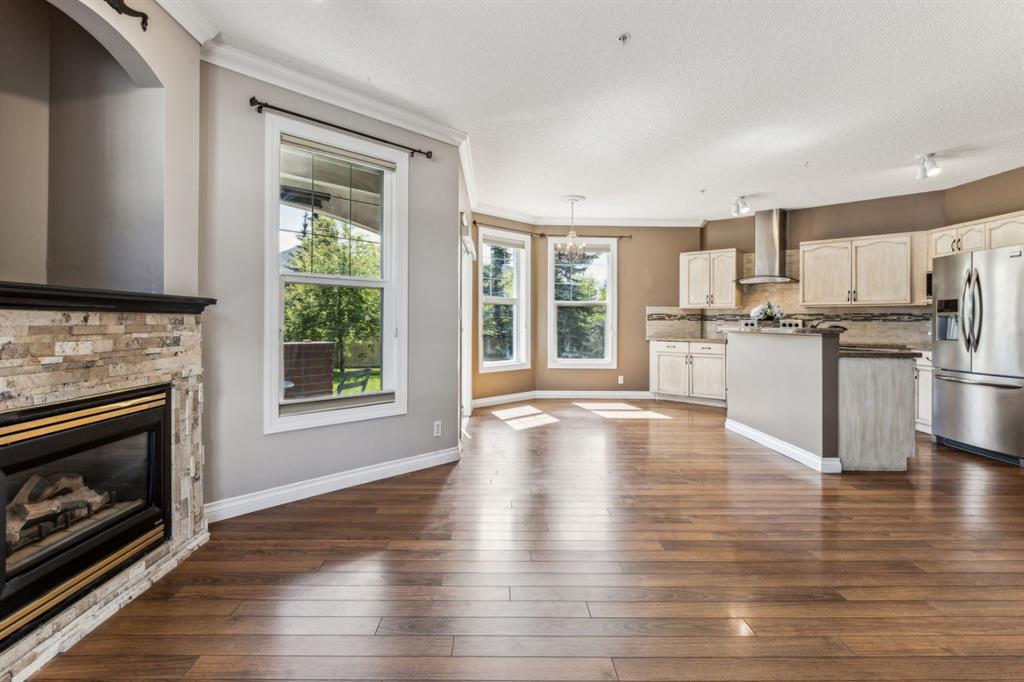 Welcome Home to this bright and spacious corner unit condo located in the heart of McKenzie Towne, Calgary. This main floor residence offers a convenient and open-concept layout with two titled parking stalls and direct access to a large green space. Upon entering, you'll be greeted by high-quality laminate flooring and elegant crown moulding that flows throughout the living space. The kitchen has been tastefully updated with a newer backsplash, granite countertops, a breakfast bar, stainless steel appliances (including a range hood) and a durable silgranite sink. Large patio doors flood the area with natural light and lead out to a private SW facing patio, perfect for outdoor relaxation. The inviting living room features a cozy stone gas fireplace, creating a warm and inviting atmosphere. The primary bedroom is generously sized and includes a convenient 3-piece ensuite bathroom. The second bedroom is located in its own wing of the home, offering privacy and space, along with a separate 4-piece bathroom nearby. Additional highlights of this condo include a spacious storage room and in-unit laundry for added convenience. You'll also benefit from both underground and surface titled parking spaces, along with an extra storage locker. The building itself offers a fantastic party room and library as well as had some significant improvements in 2017/2018 such as new windows and a new roof! Located within walking distance to the vibrant High Street in McKenzie Towne, you'll have easy access to a variety of amenities including grocery stores, shops, restaurants, and more. This condo unit combines comfort, style, and practicality in a highly sought-after community. Don't miss out on this fantastic opportunity!